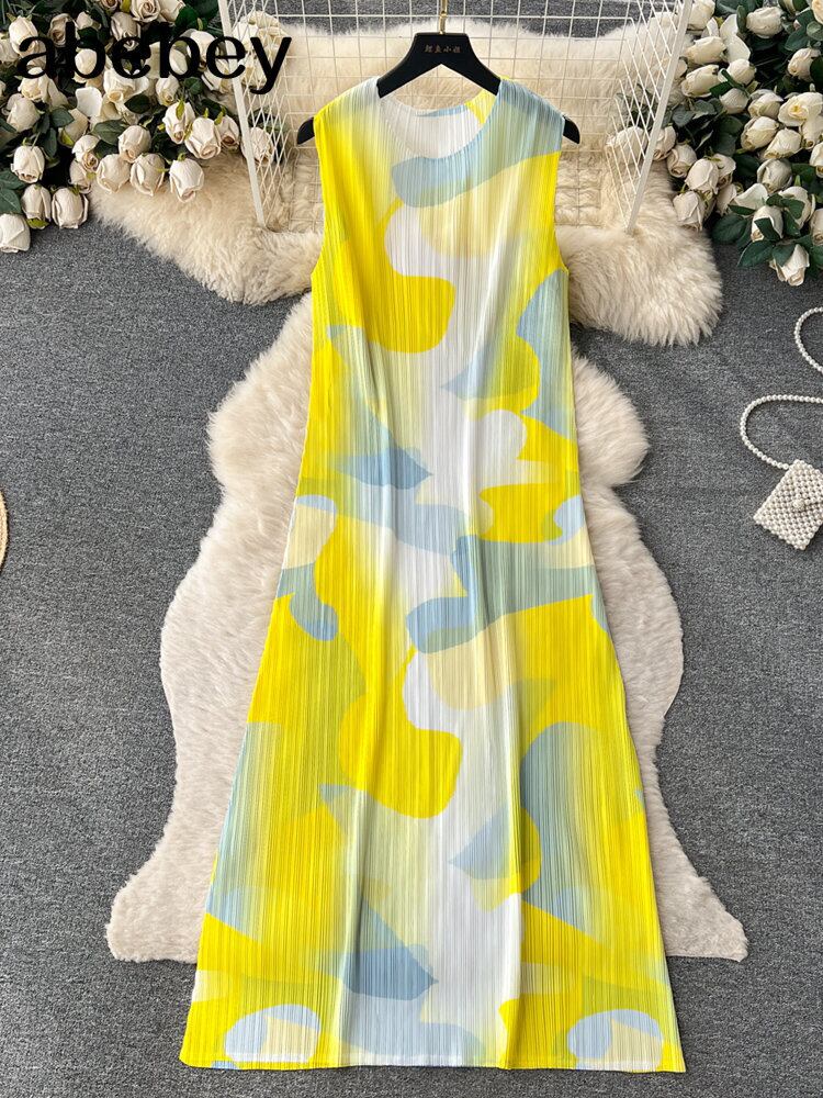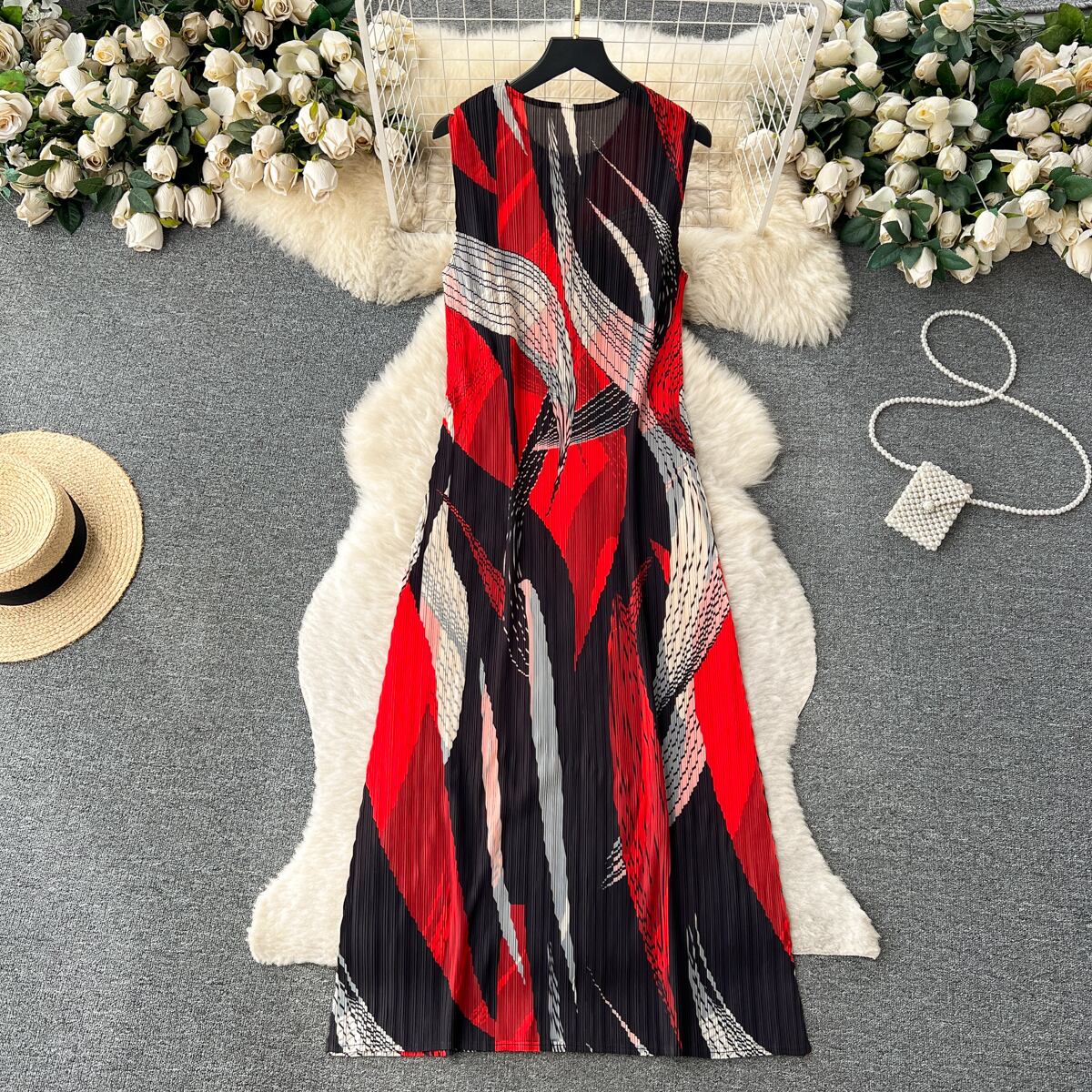 夏三宅プリーツロングドレス O ネックノースリーブタンクフラワープリント弾性ホリデー Vestidos エラスティック 伸縮 サマー 夏物 Oネック フラワーデザイン