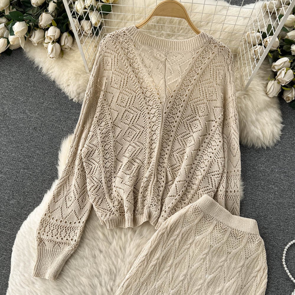 ニットスリットスカートスーツ長袖トップラップヒップロングスカートツーピースセットセクシースリムスーツストリート