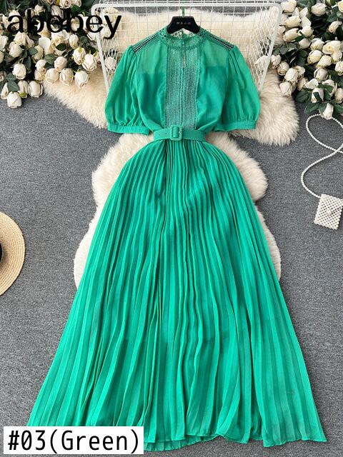 甘いシフォン花柄ロングドレスベルト半袖シャーリング弾性プリーツサンドレスボヘミアンビーチソリッドドレス ショート ハーフスリーブ エラスティック 伸縮 大人ガーリー スウィート キュート カジュアル ハーネス ソリッドカラー