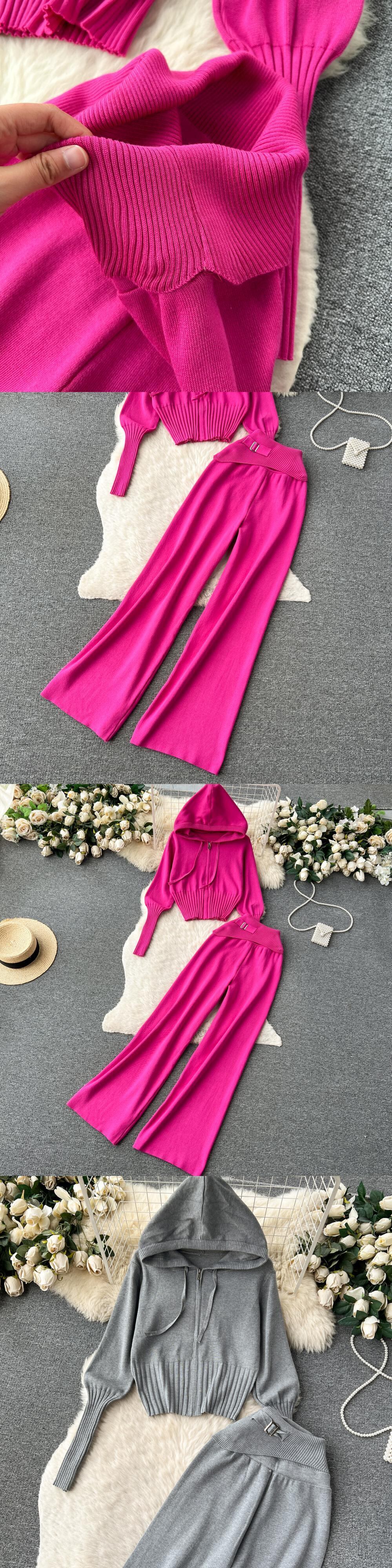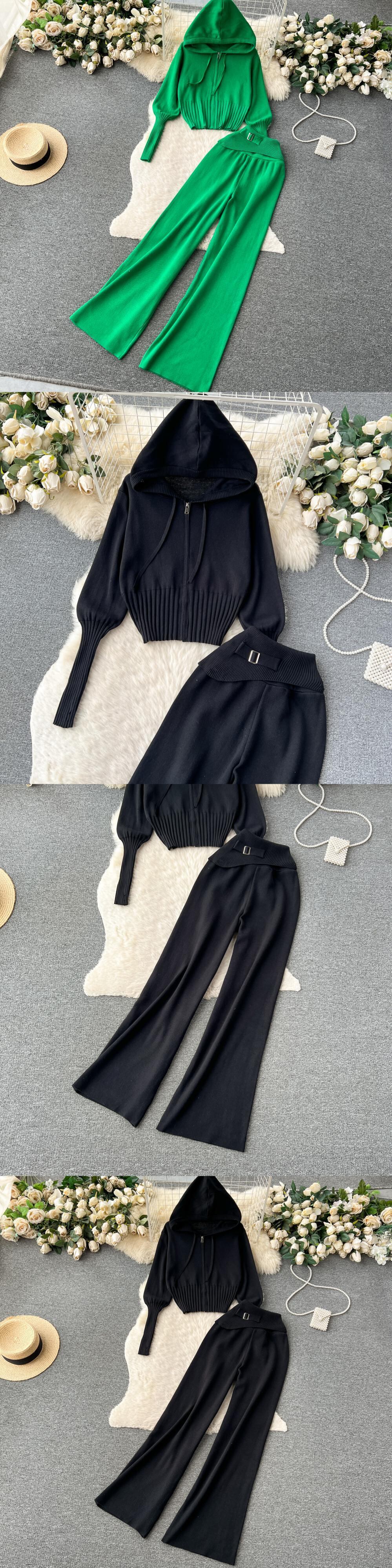 ニット 2 個セットトラックスーツ長袖ジッパーフード付きセータージャケットクロップトップフレアパンツストレッチマッチングスーツ ロング ソリッドカラー