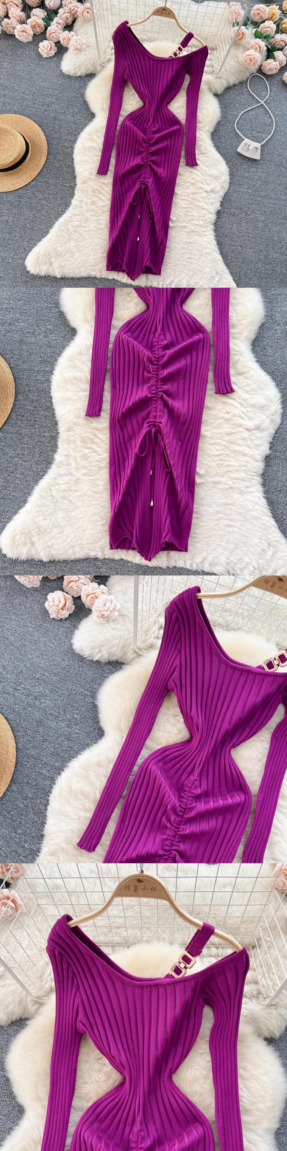 秋ニットドレスワンショルダーセクシースリム弾性特大基本ボディコンロングドレス冬ニット暖かいセータードレス エラスティック 伸縮 オータム 秋物 ウィンター 冬物