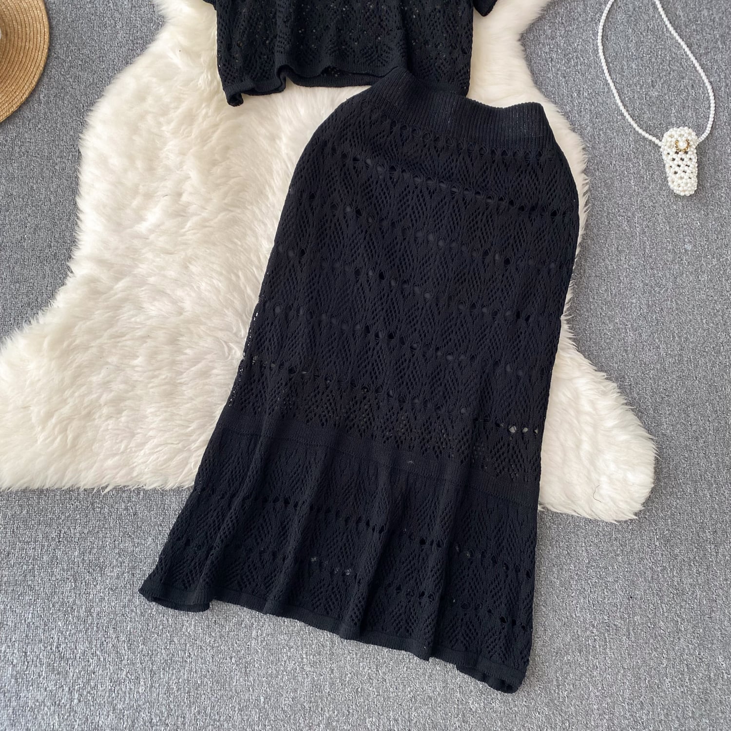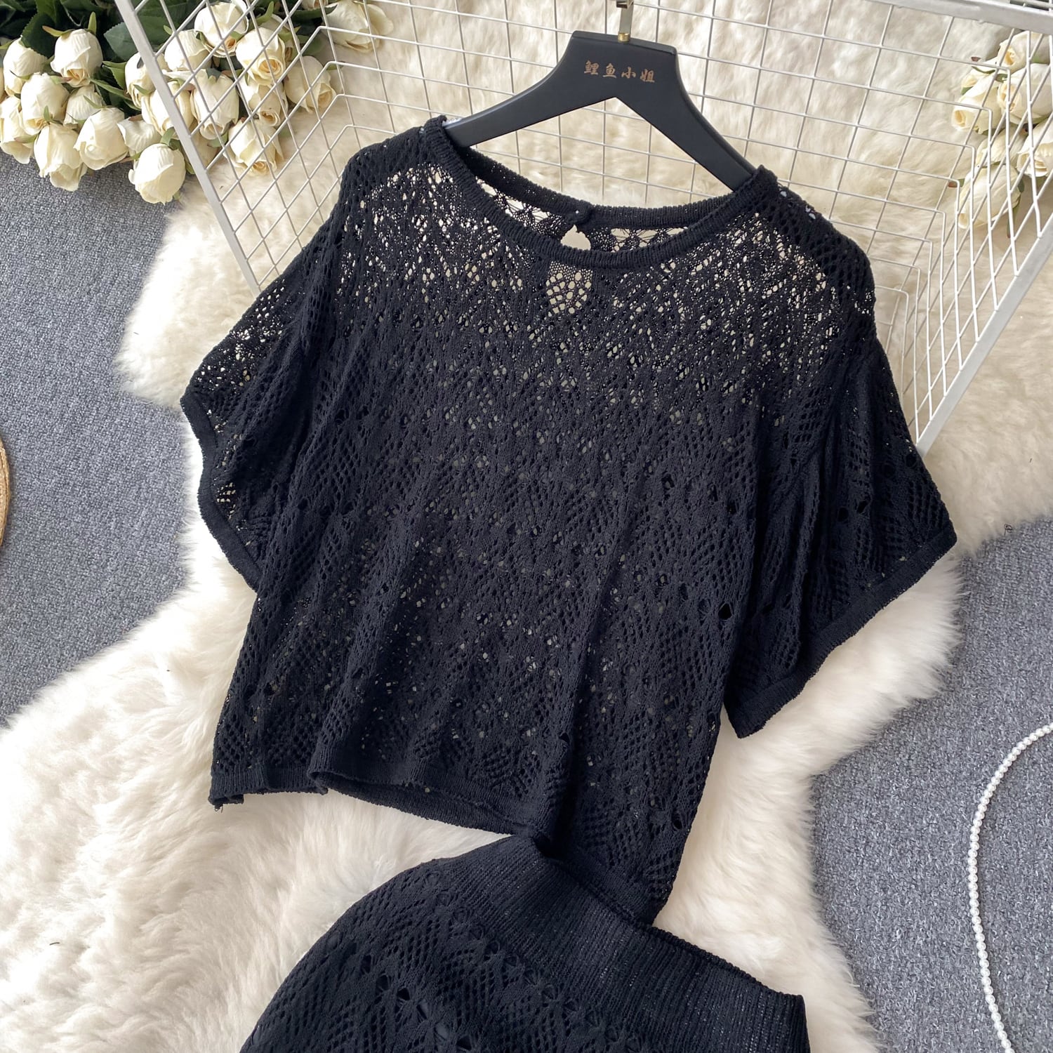 夏ニット 2 ピーススーツルーズ半袖トップ + 弾性ロングスカートフランス人休暇ボヘミアンビーチセット ショート ハーフスリーブ エラスティック 伸縮 サマー 夏物 ソリッドカラー