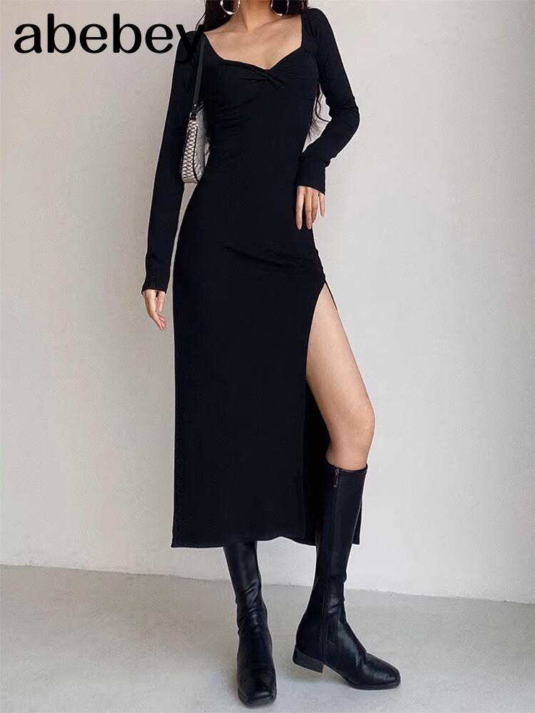 セクシーセータードレススプリット V ネック長袖マキシロングドレス秋ストリートニットボディコンドレス オータム 秋物 Vネック ソリッドカラー