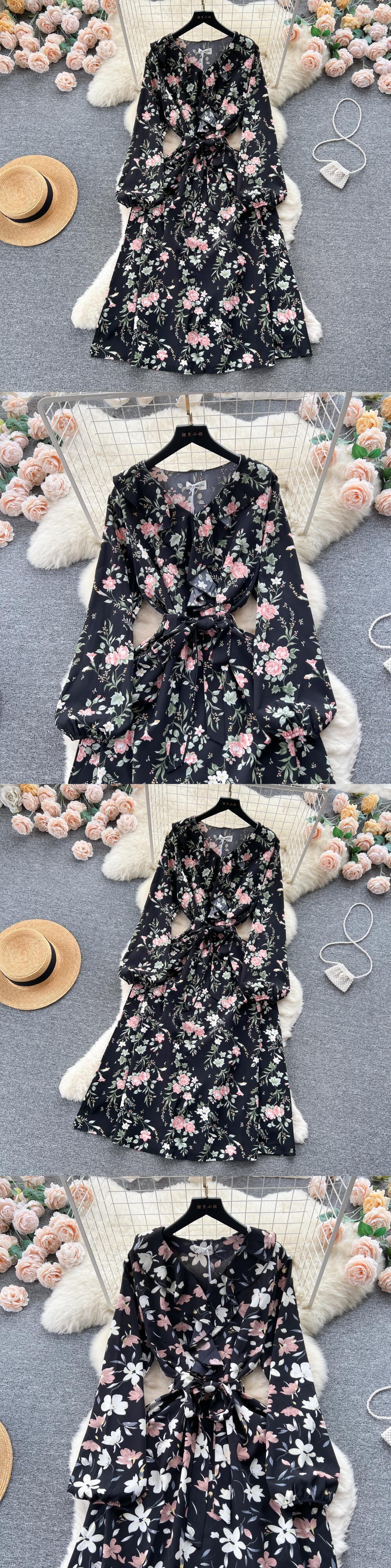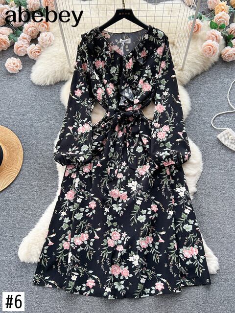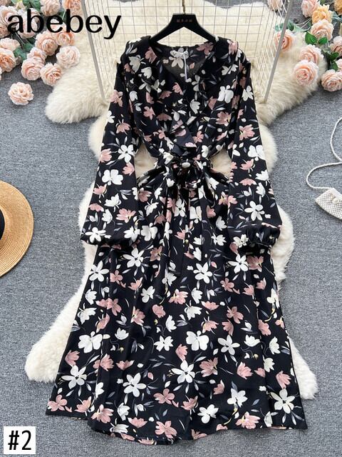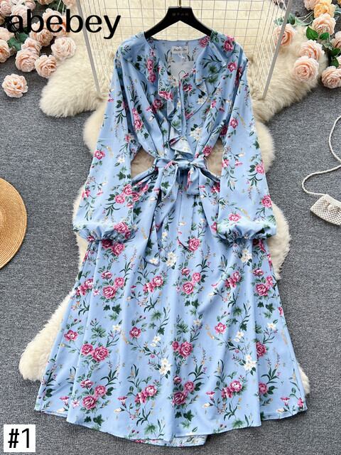 甘い花柄ミディドレス V ネックランタン長袖ウエストドレープ A ライン Vestidos 秋 ロング 大人ガーリー スウィート キュート カジュアル オータム 秋物 Vネック Aライン
