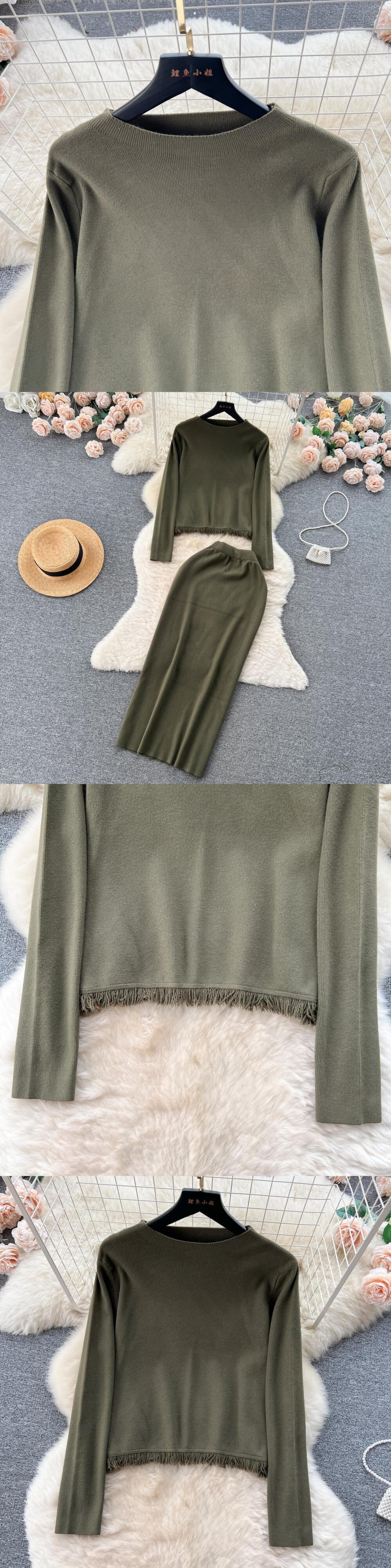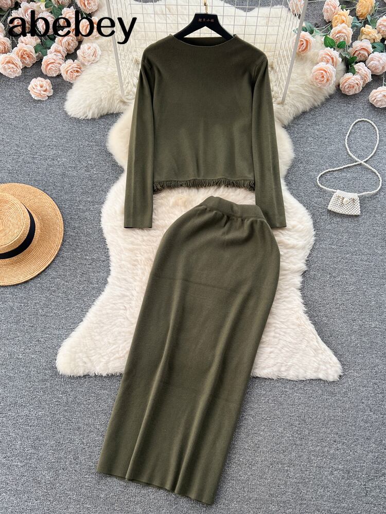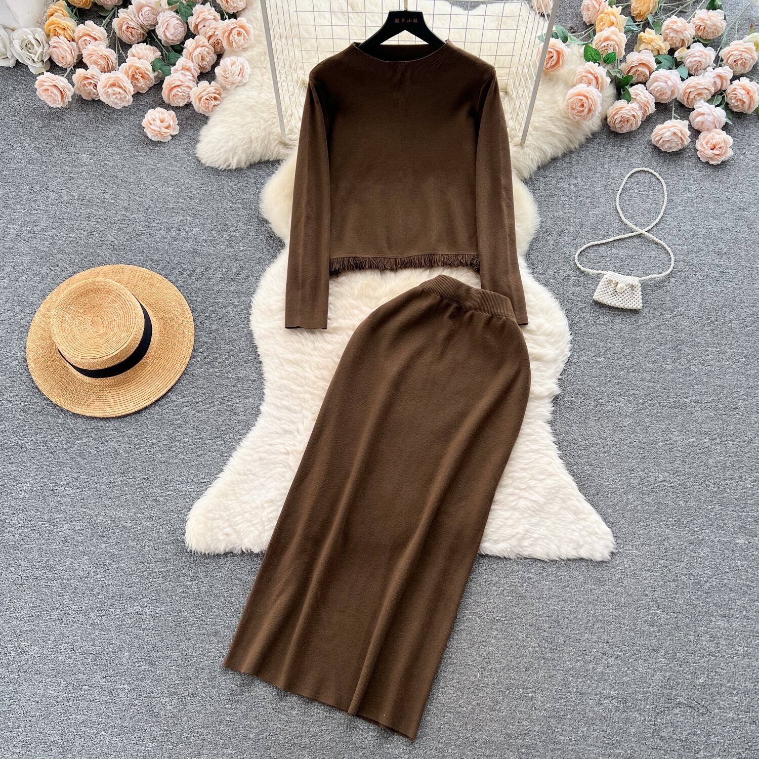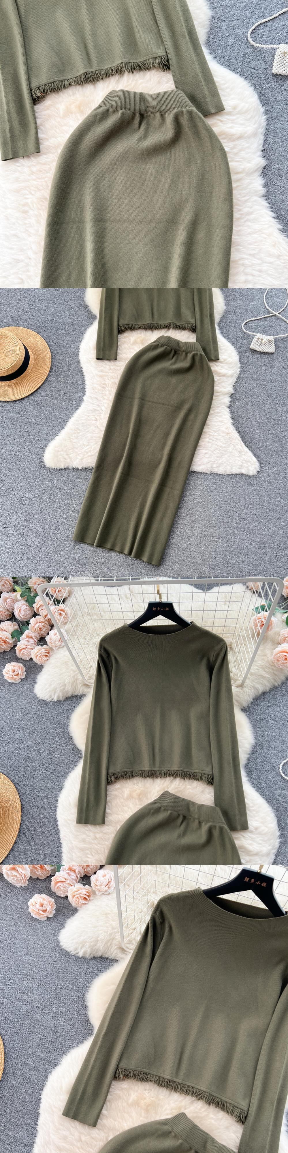 甘いスーツ O ネック長袖テルプルオーバー + ウエストボディコンロングスカートスタイルセーターセット 大人ガーリー スウィート キュート カジュアル Oネック ソリッドカラー