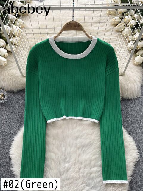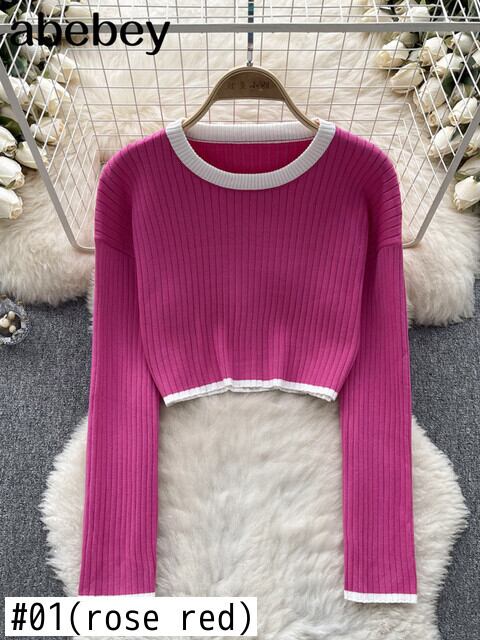 冬ストリートパッチワーク厚みあるプルオーバースリム弾性ウエスト O ネックショートオフィスレディ暖かいニットセーター エラスティック 伸縮 ウィンター 冬物 Oネック 会社 学校 通勤や通学にも