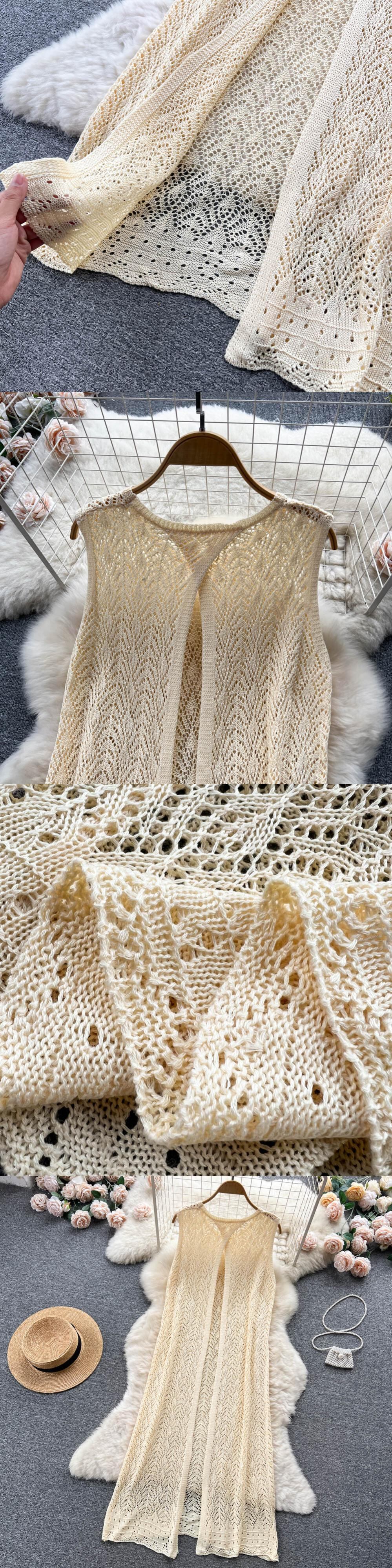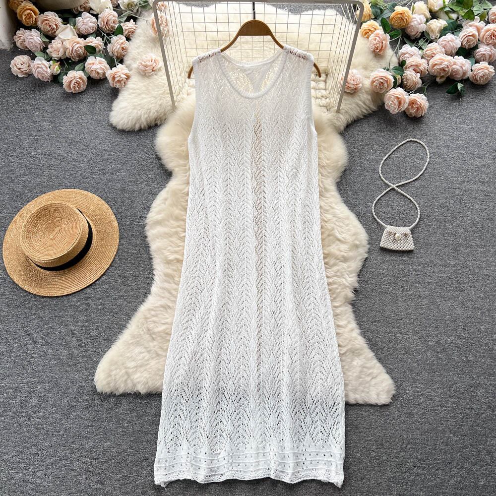 セクシーニットビーチドレス中空アウト O ネックノースリーブドレス夏シースルーホワイトホリデー Vestidos サマー 夏物 Oネック