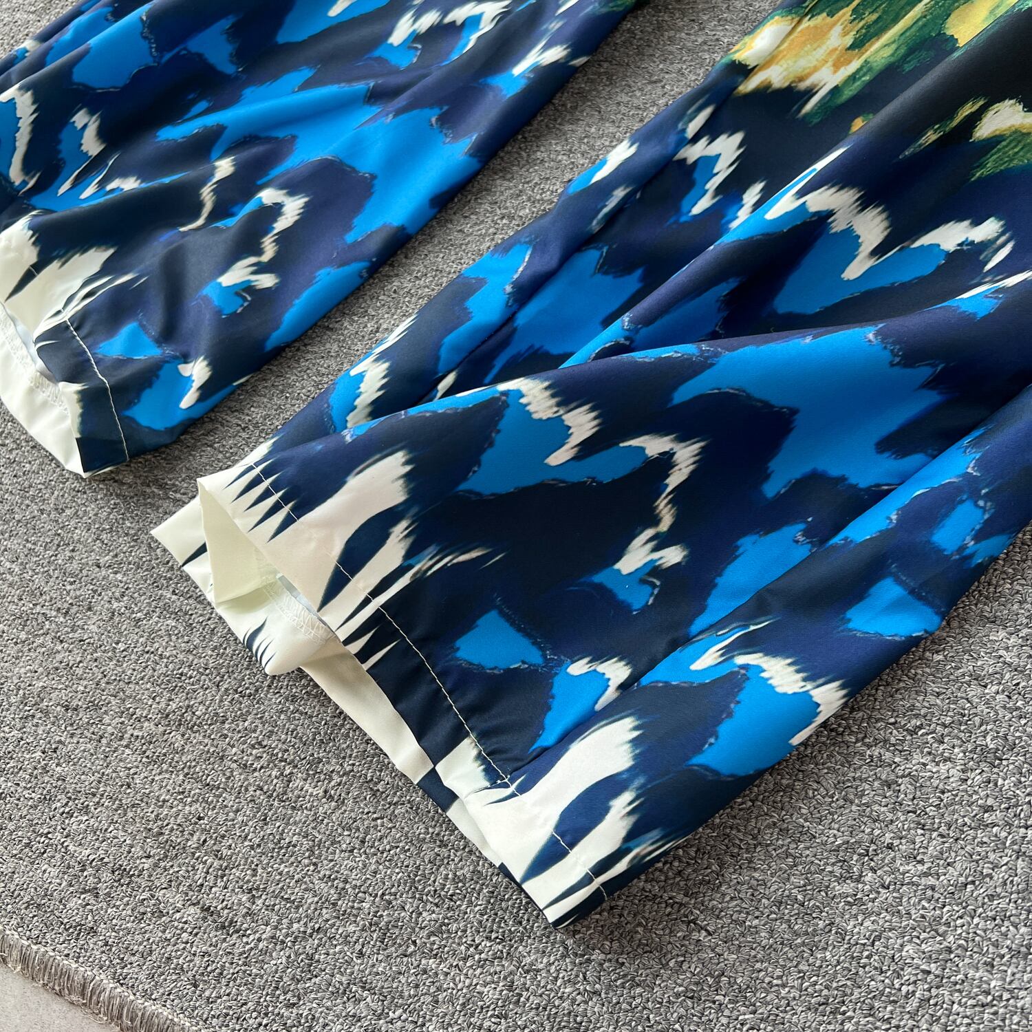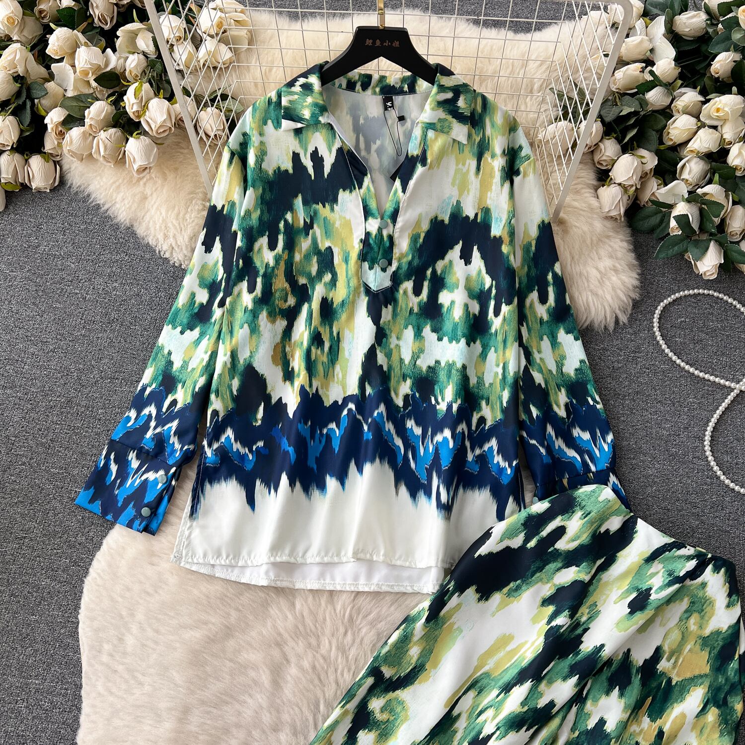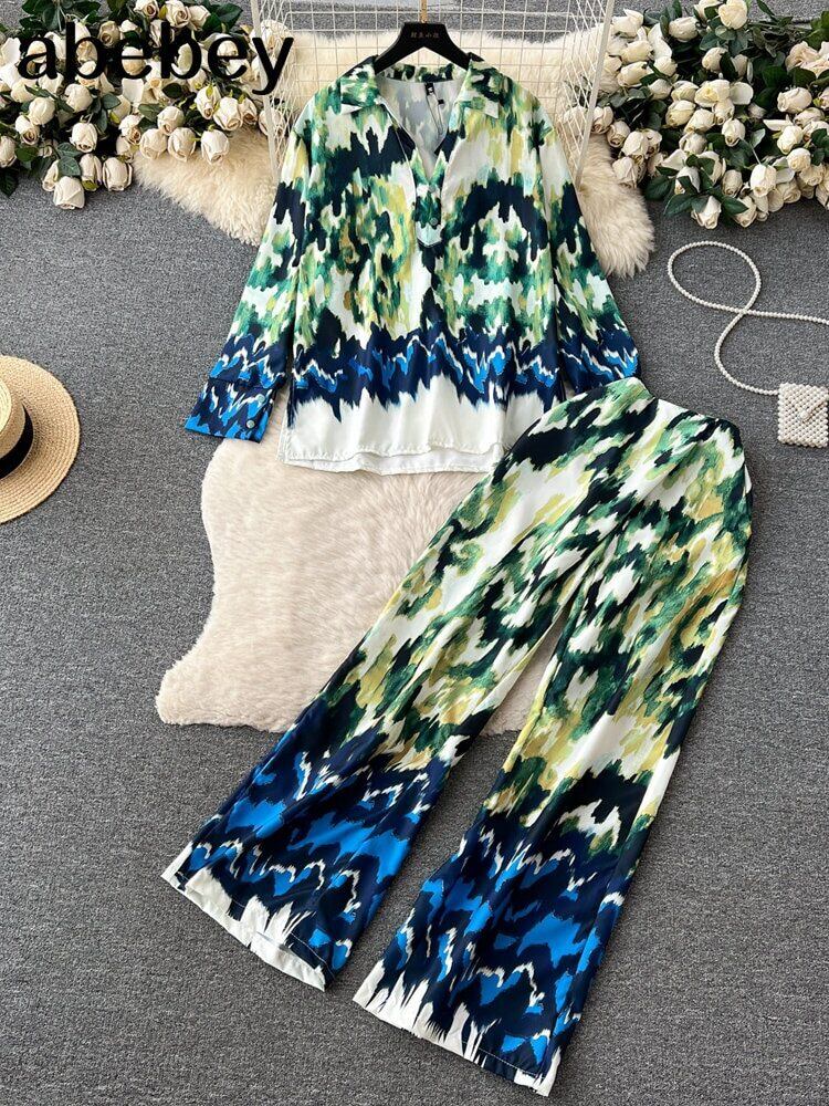プリントシャツパンツセットシングルブレストノッチシャツワイドレッグ弾性ウエストズボンスーツ春服 エラスティック 伸縮 スプリング 春物 ワイドパンツ