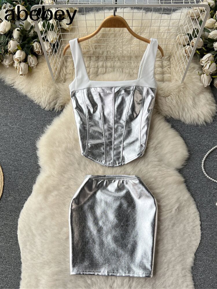 夏 Pu レザー 2 枚スーツストラップ背中開いたタンクトップ + ショートスカートパッチワーク Hotsweet ビーチセット 大人ガーリー スウィート キュート カジュアル サマー 夏物