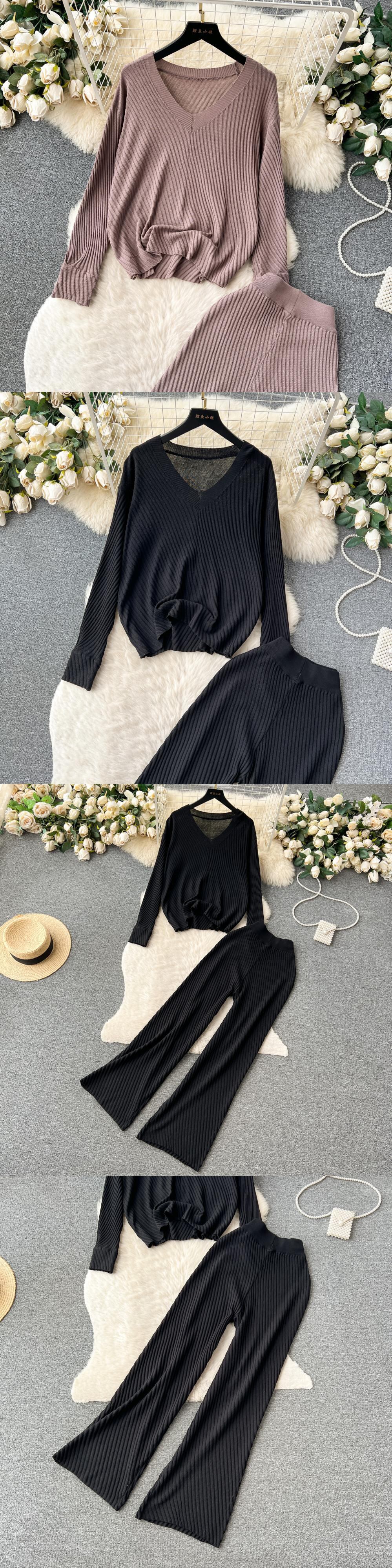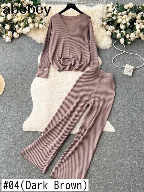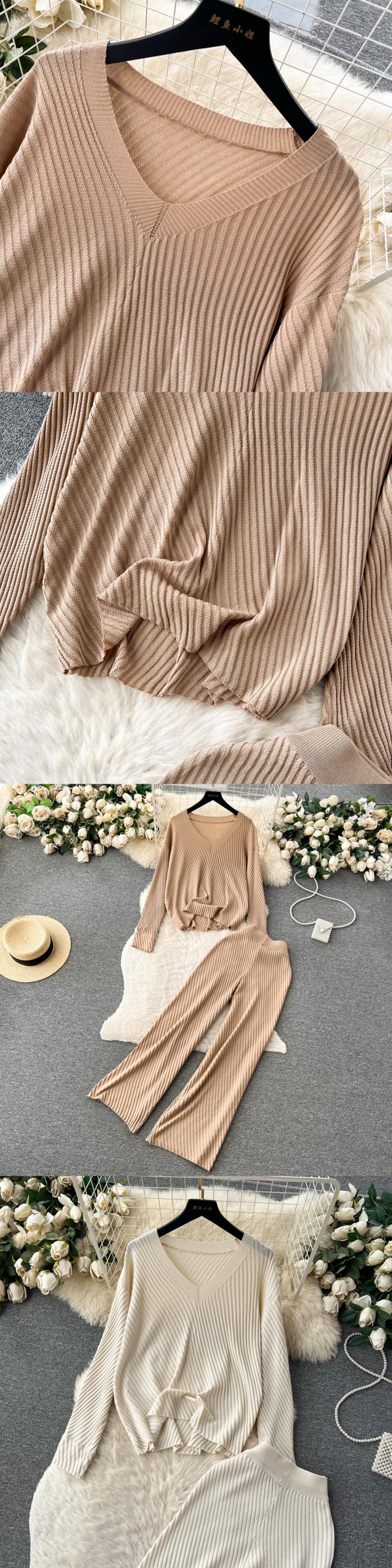 ニットセットストライプルーズプルオーバー+ワイドレッグロングパンツ秋スタイルセータースーツ オータム 秋物 ワイドパンツ ソリッドカラー