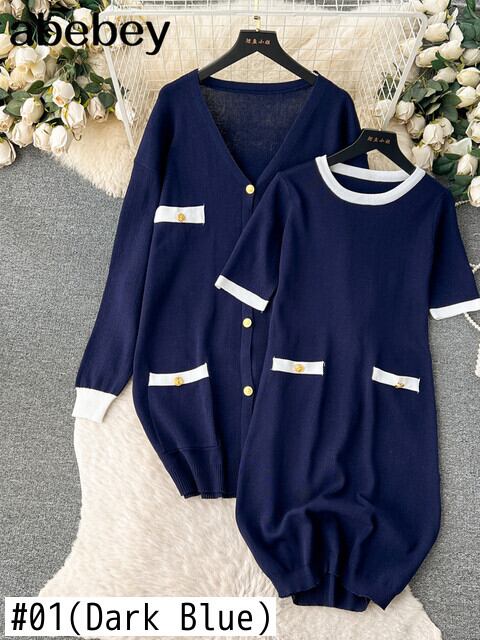 ボタンニットセットルーズ長袖ロングカーディガン+弾性ドレスフレンチスタイルツーピースセット エラスティック 伸縮