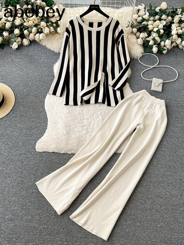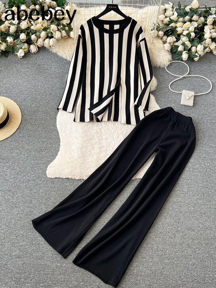 2/2 枚セットスプリットジャージシックストライプ特大セーター + 巾着ワイドレッグパンツスーツ ワイドパンツ