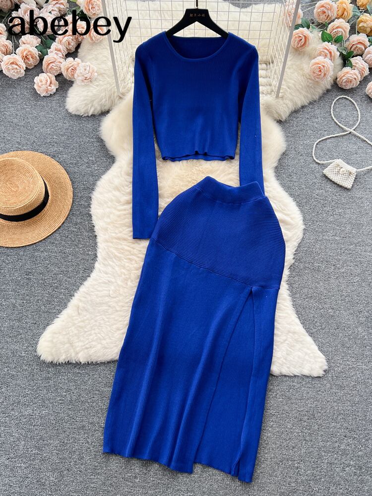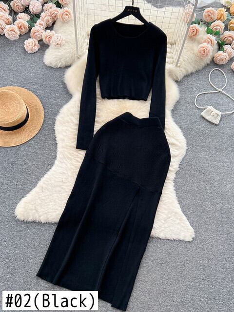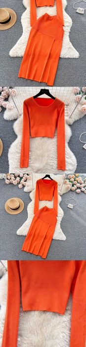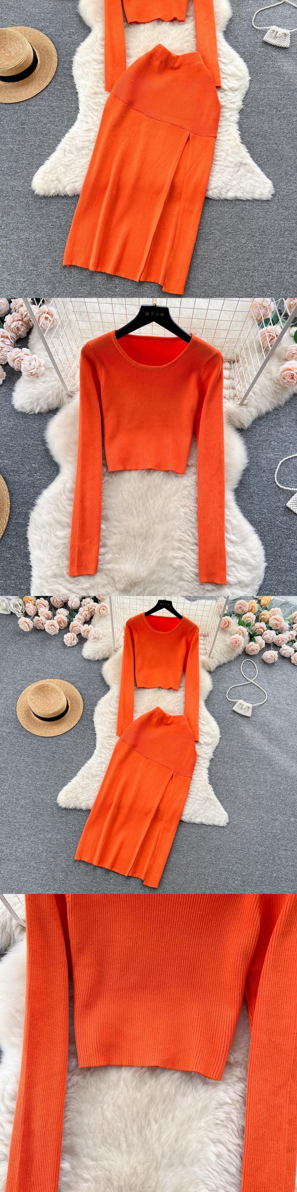 秋スキニーセット O ネックフルスリーブウエストボディコン分割スカートフランスレトロセータースーツ オータム 秋物 Oネック ソリッドカラー