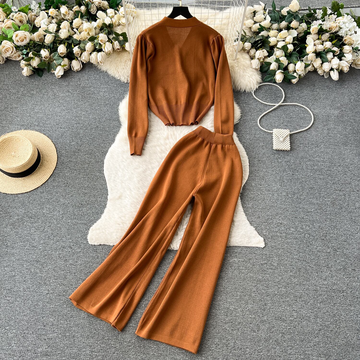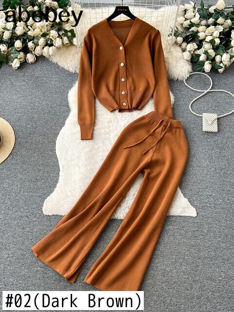 プレッピースタイルニットカーディガントラックスーツシングルパンカーディガン衣装長ズボンワイドレッグパンツスーツ 2 点セット ロング ワイドパンツ