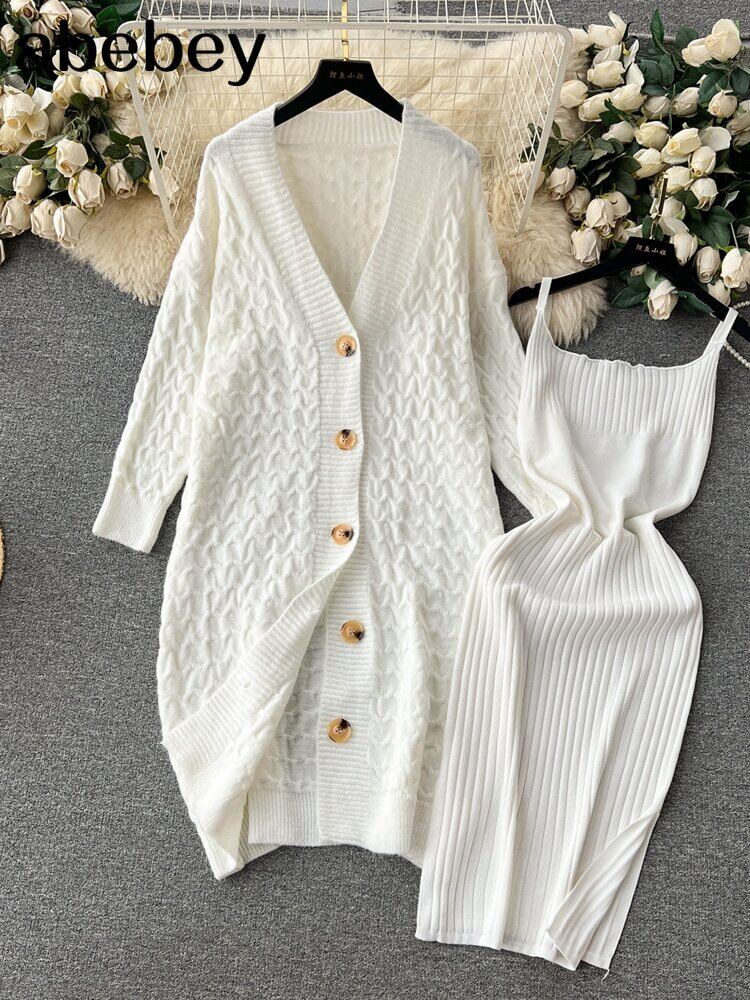 レディース秋ソリッドカラーニット2ツーピースロングカーディガンセクシーVネックスリムロングセータードレスカーディガンセット オータム 秋物