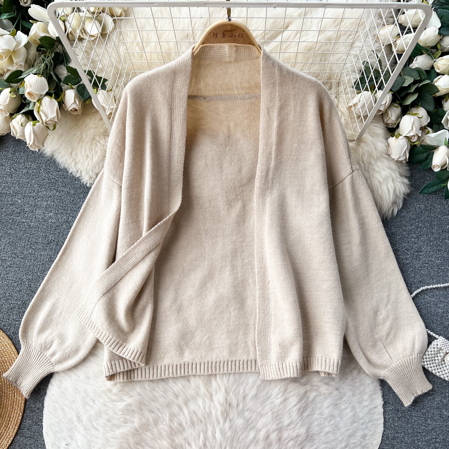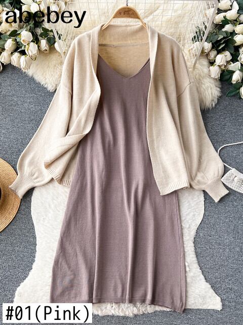 ニットセットルーズ長袖ロングカーディガンセーター + 弾性ドレスフレンチスタイルツーピースセット衣装 エラスティック 伸縮 ソリッドカラー