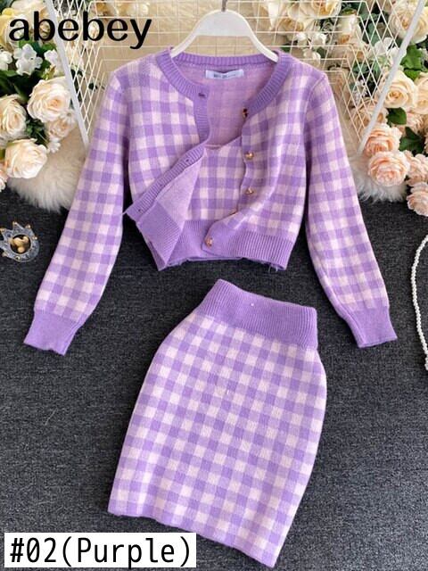 チェック柄ニット 3 ピーススーツ秋ボタンカーディガントップ + ミニキャミソール + 弾性ショートスカートセーターセット エラスティック 伸縮 オータム 秋物
