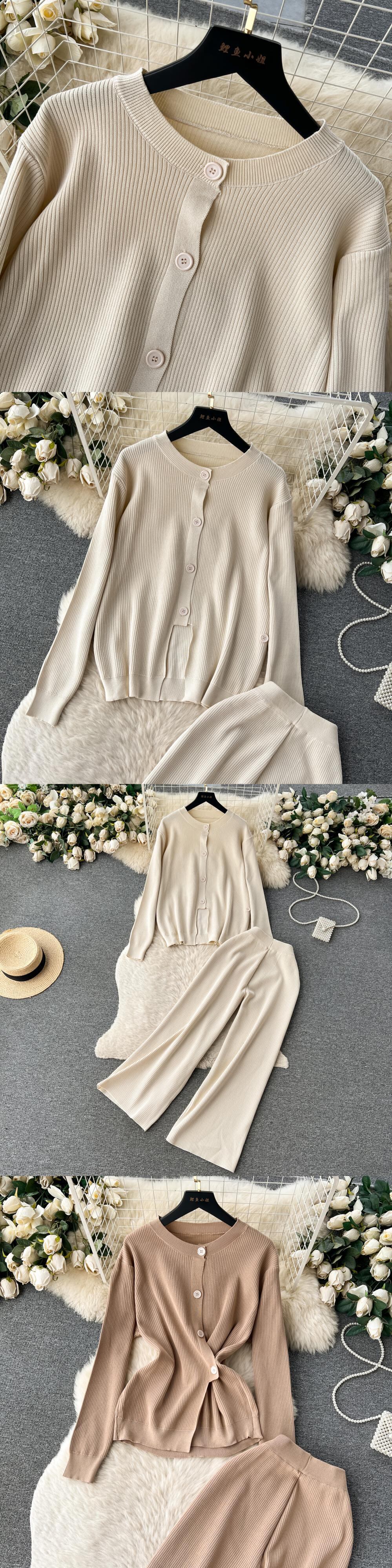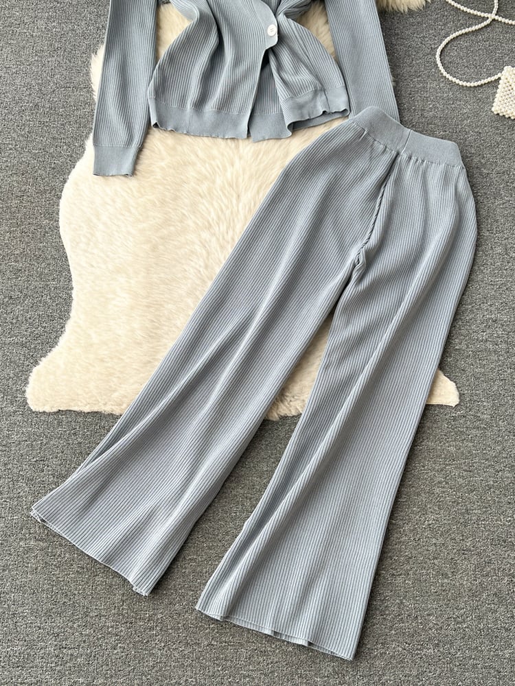 特別ニットスーツ不規則シングルブレスト中空アウトカーディガン+ワイドレッグロングパンツ秋セット オータム 秋物 ワイドパンツ ソリッドカラー