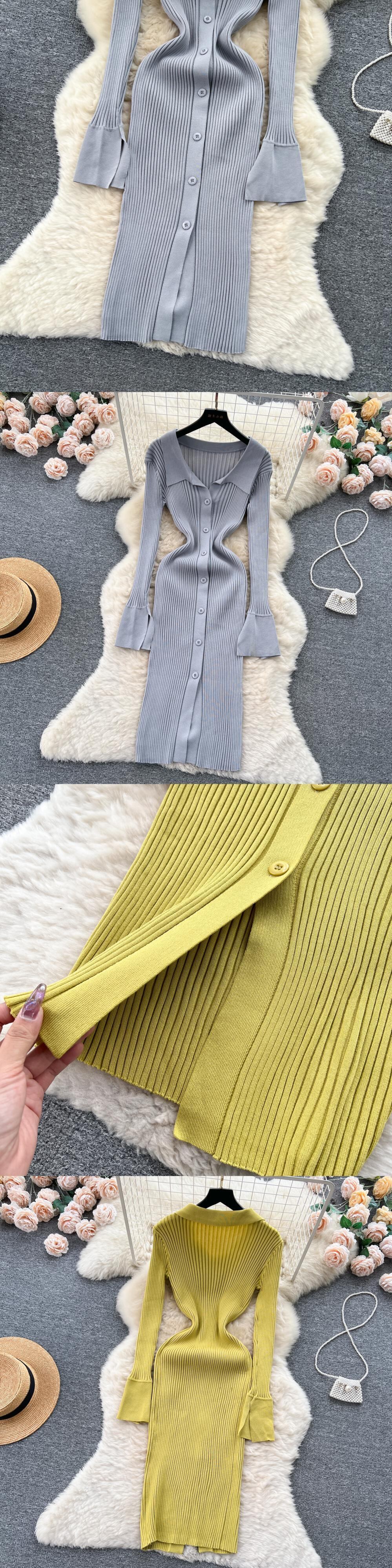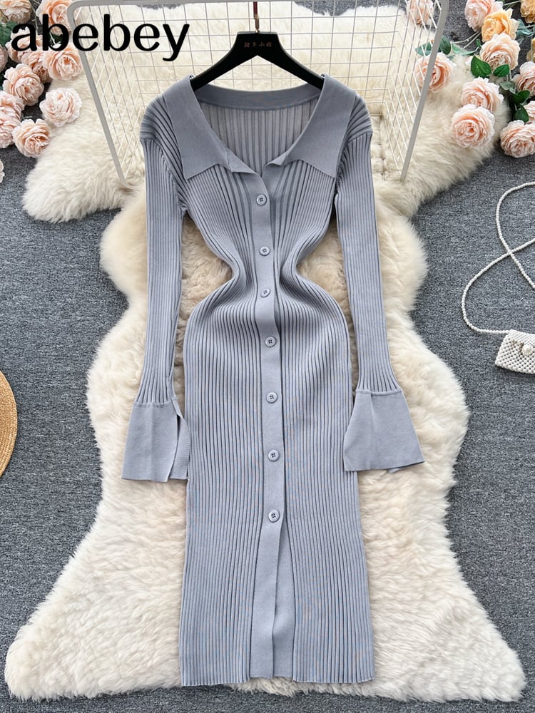 レトロニットミディドレスターンダウン襟長袖弾性ウエストボタン冬暖かいセータードレス ロング エラスティック 伸縮 ウィンター 冬物