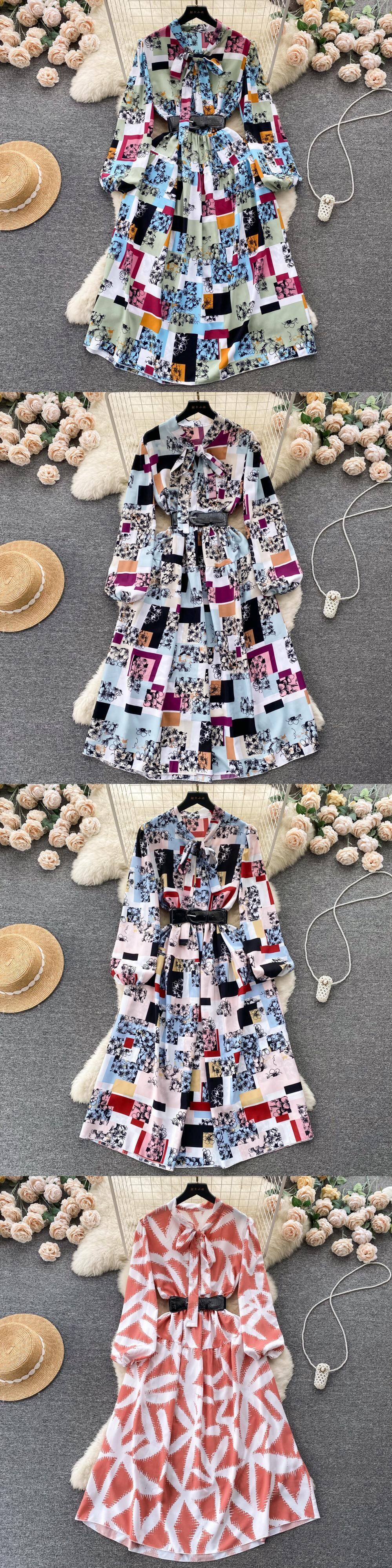 フランスレトロシフォンドレス花柄ボーイネックロングランタンスリーブ包帯弓ルーズ秋 A ラインマキシドレス リボン オータム 秋物 Aライン