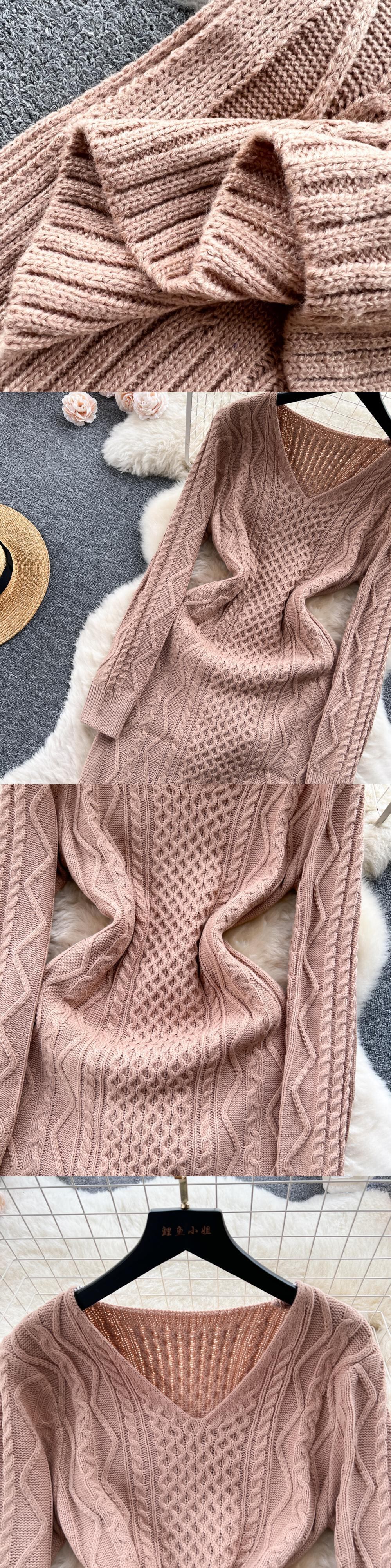 レトロニットマキシボディコン無地 V ネック長袖ラップヒップドレス秋冬スリムセーター Vestido ロング オータム 秋物 ウィンター 冬物 Vネック ソリッドカラー