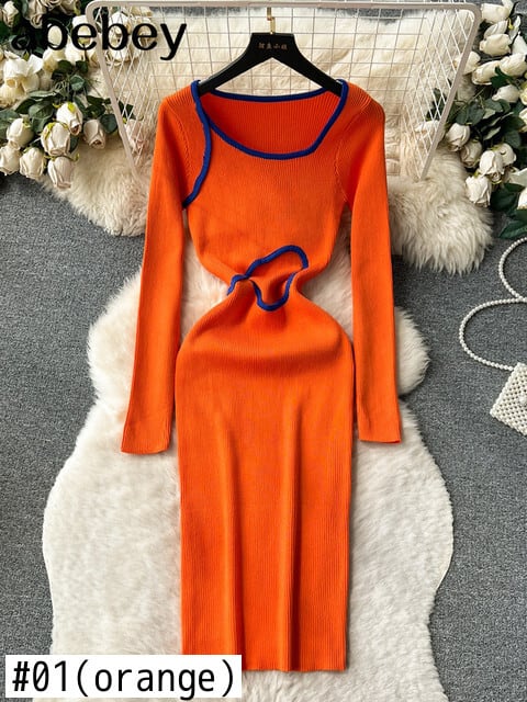 秋ニットドレス O ネック長袖中空スリムフィットフランスカラーブロックボディコンパーティードレス ロング オータム 秋物 Oネック