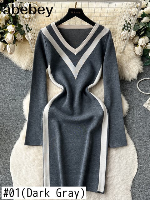 シース秋ドレス V ネック長袖ストリートレトロ厚く暖かいニットセーターミディドレス ロング オータム 秋物 Vネック