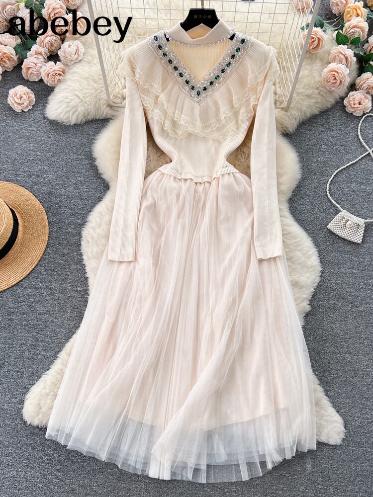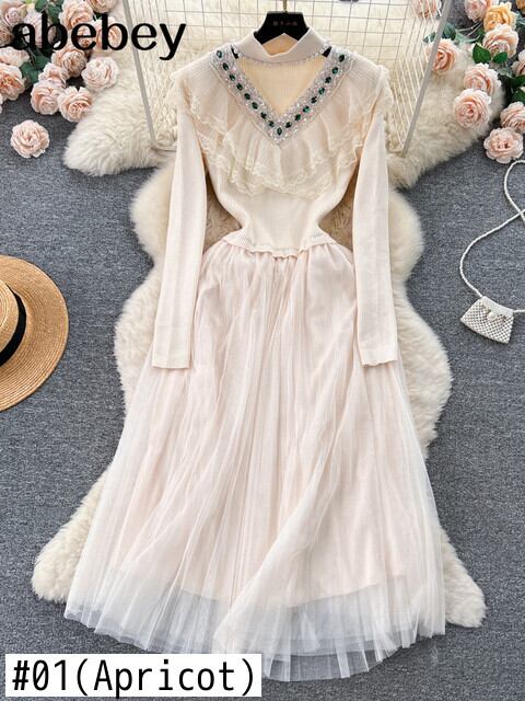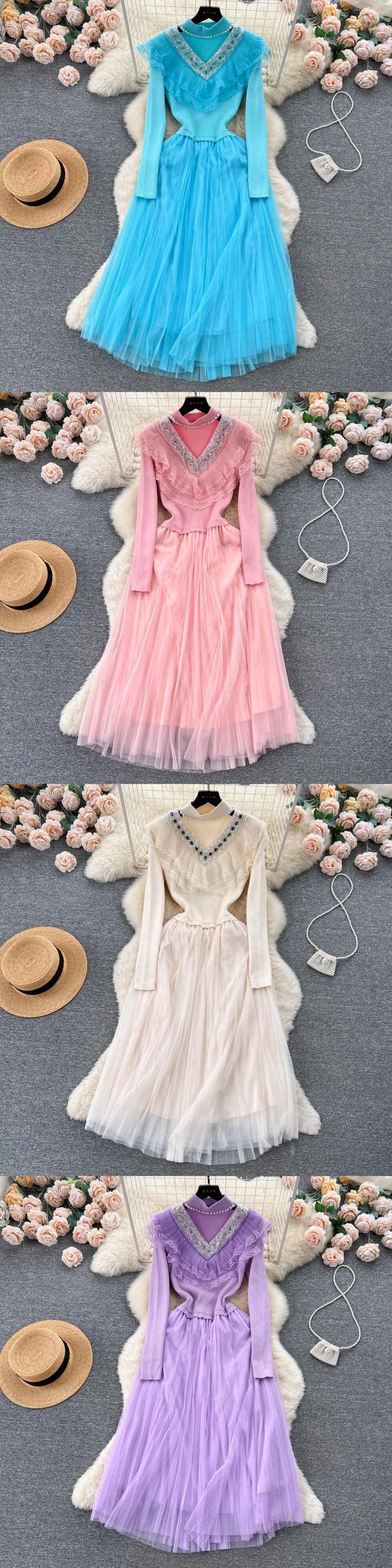 ドレス パール ビーズ スパンコール 装飾 フリル シック ニット メッシュ パッチワーク ロング A ライン ドレス ラッフル Aライン 真珠