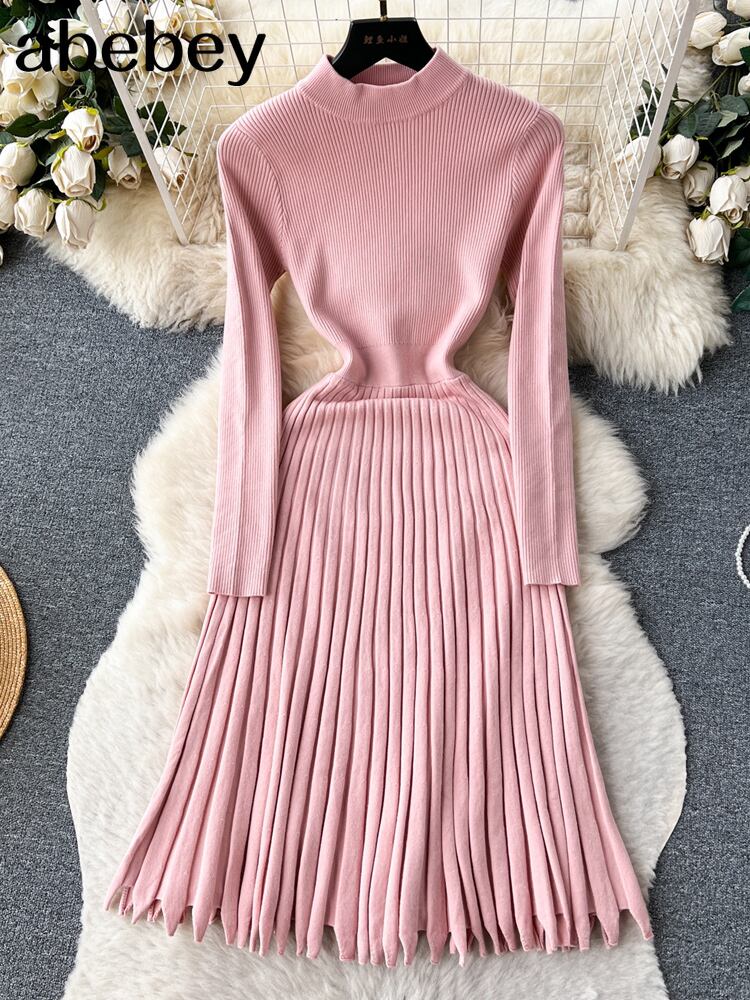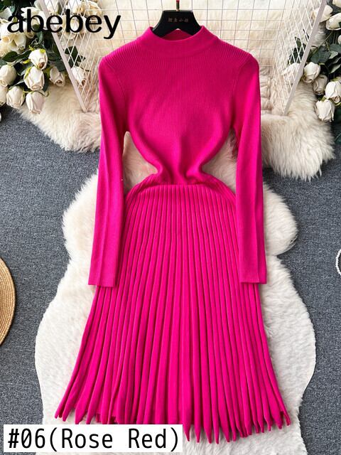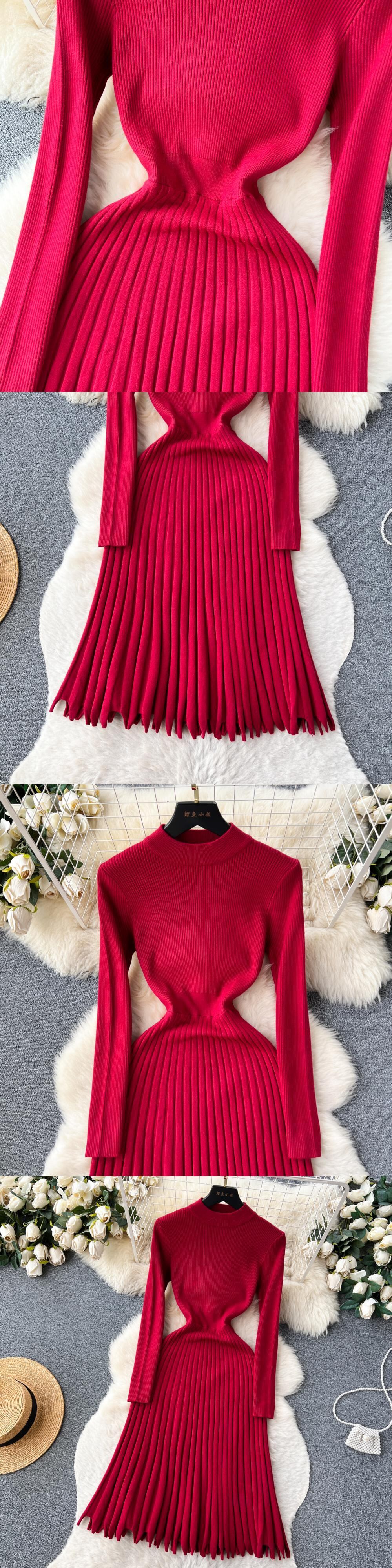 秋セーターボディコンロングドレス O ネック長袖スリム弾性ウエスト厚いプリーツ暖かいニットドレス エラスティック 伸縮 オータム 秋物 Oネック