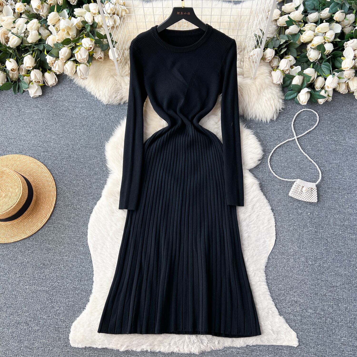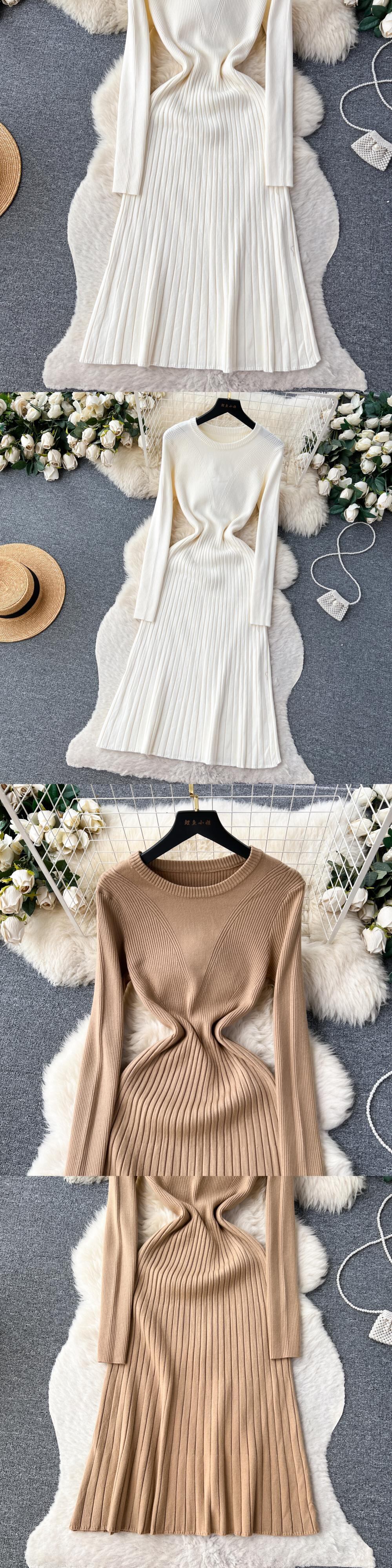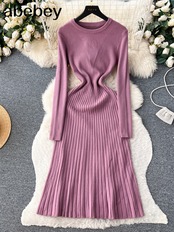 フランス OL ドレス O ネック中空アウトボタン長袖冬ニットストライプ A ラインセータードレス ロング ウィンター 冬物 Oネック Aライン ソリッドカラー