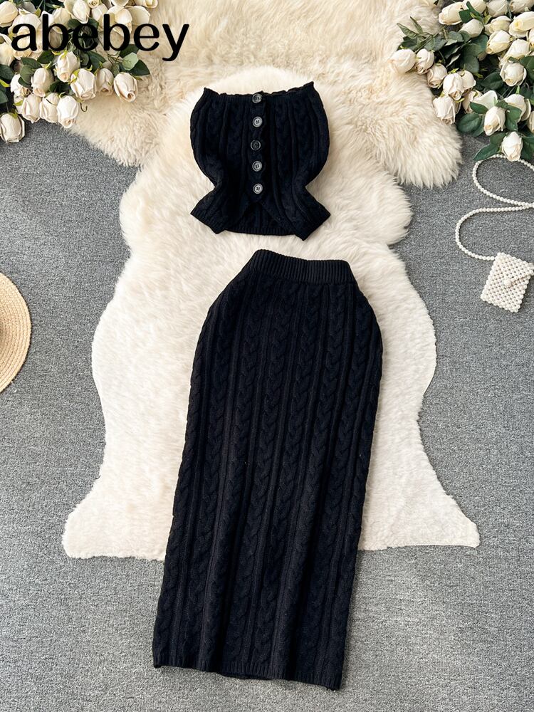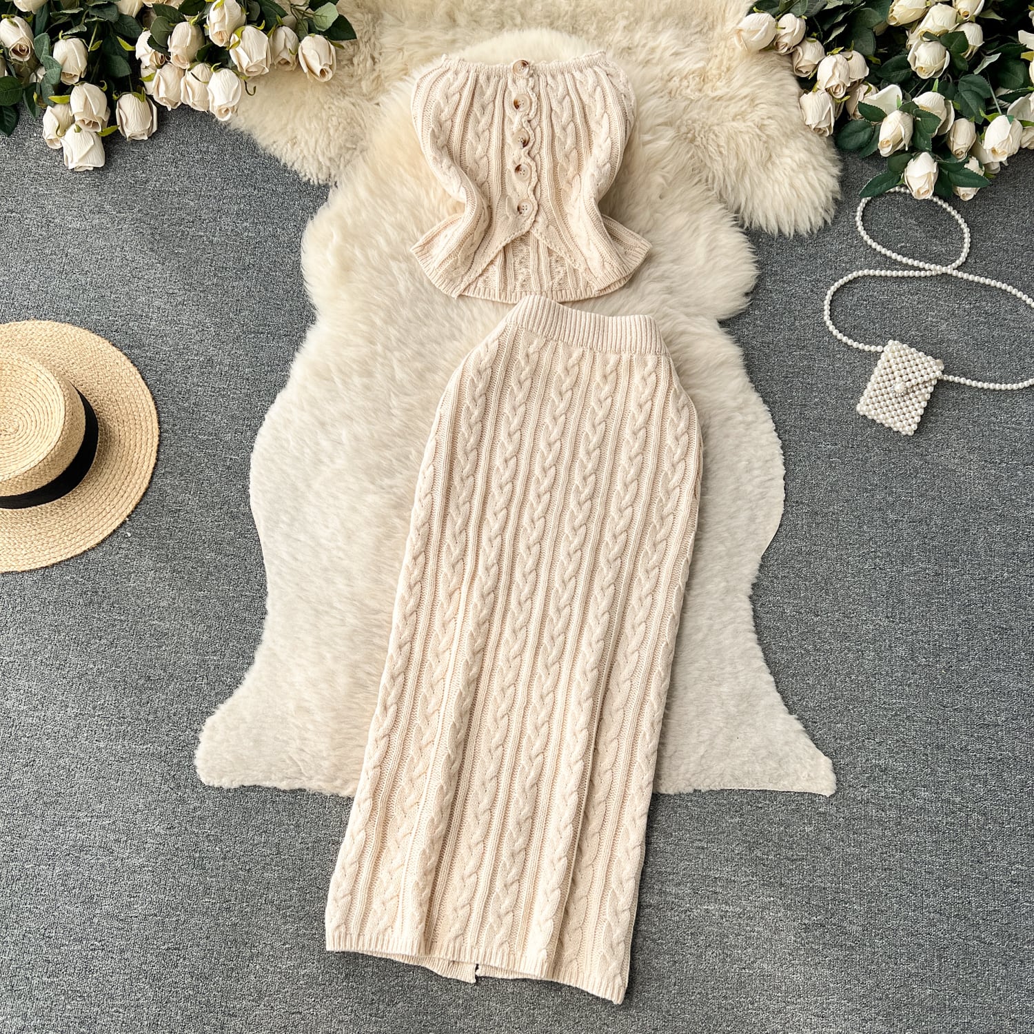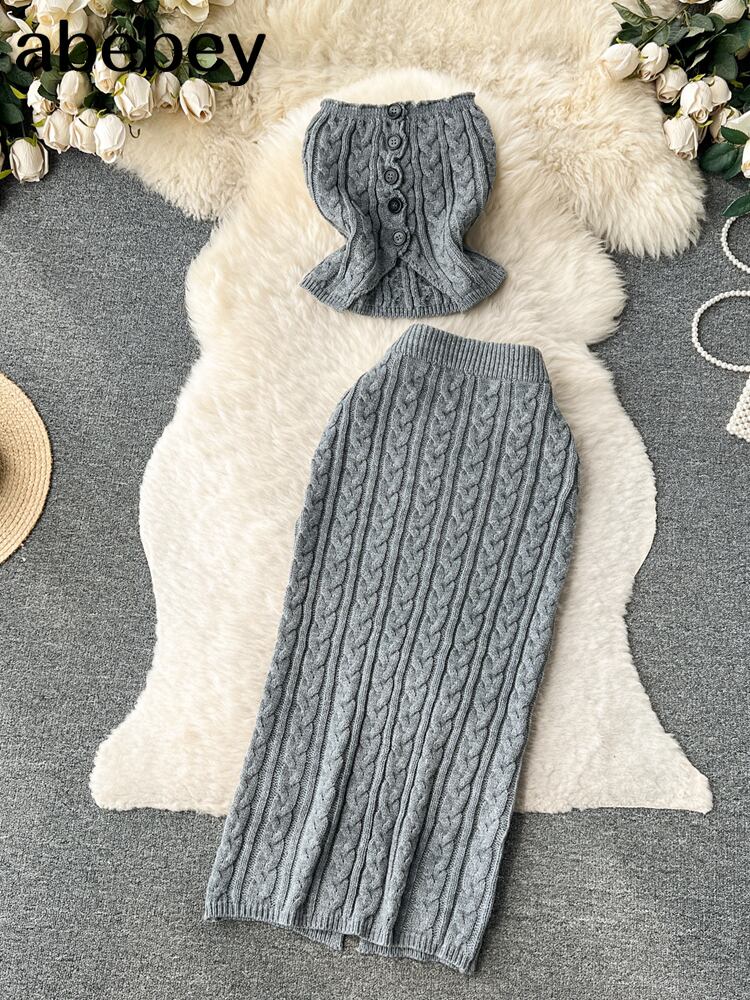 スタイルニットセットストラップレスノースリーブクロップトップ+ストライプボディコンスプリットスカートスキニーセータースーツ ソリッドカラー