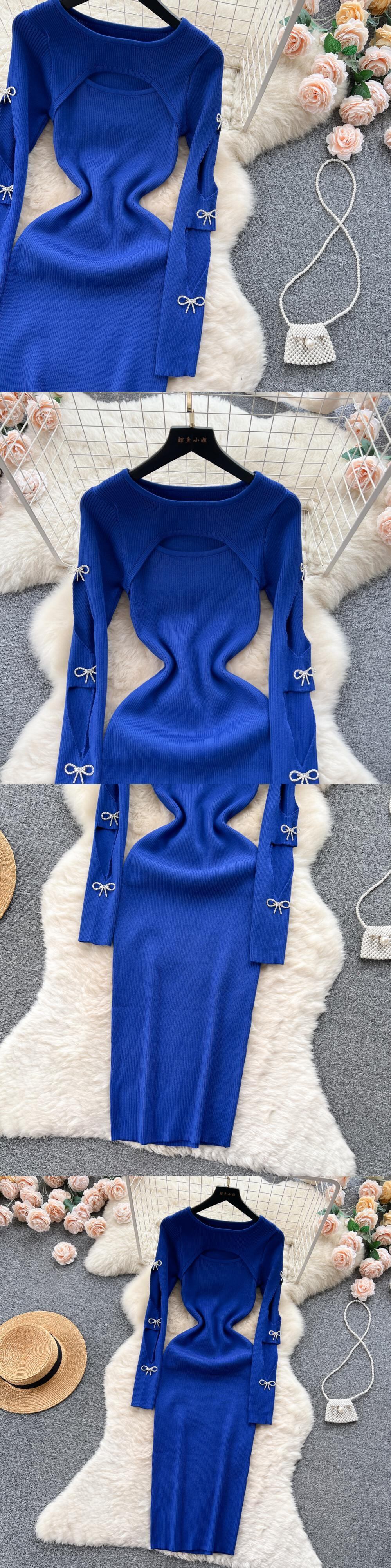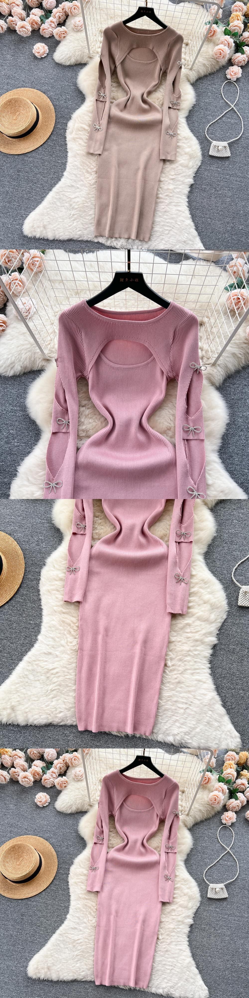秋暖かいニットミディドレス O ネックダイヤモンド長袖ボディコンストリートセクシースリムセータードレス ロング オータム 秋物 Oネック