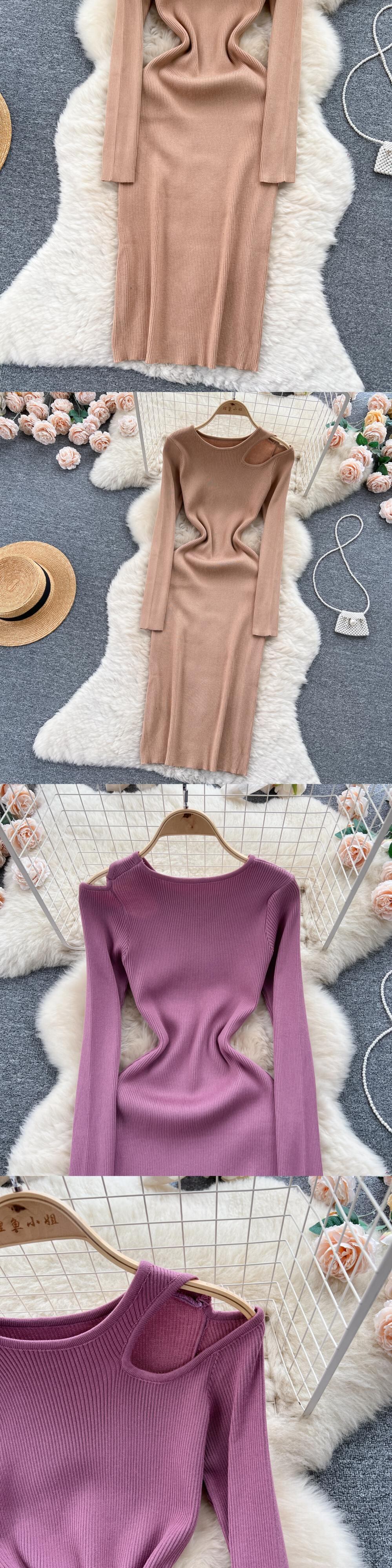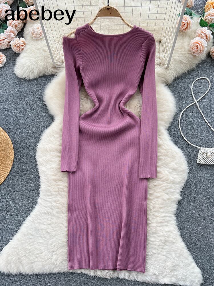 シックニットドレス O ネック長袖ソリッドボディコンスリムフィット秋パーティー中空アウトドレス ロング オータム 秋物 Oネック ソリッドカラー