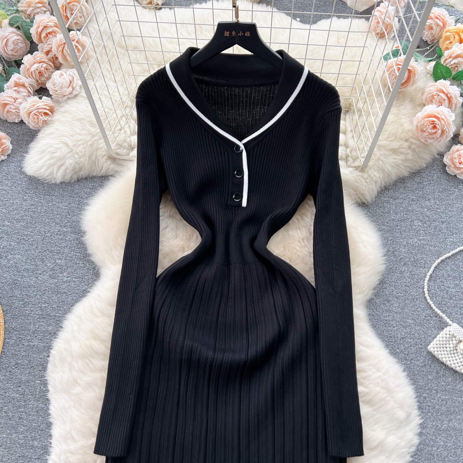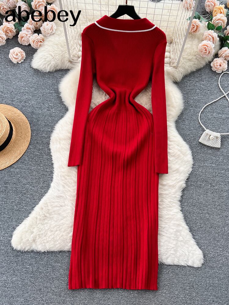 スリムニットドレス O ネックレトロ秋ストライプ長袖冬セーターロングドレス オータム 秋物 ウィンター 冬物 Oネック