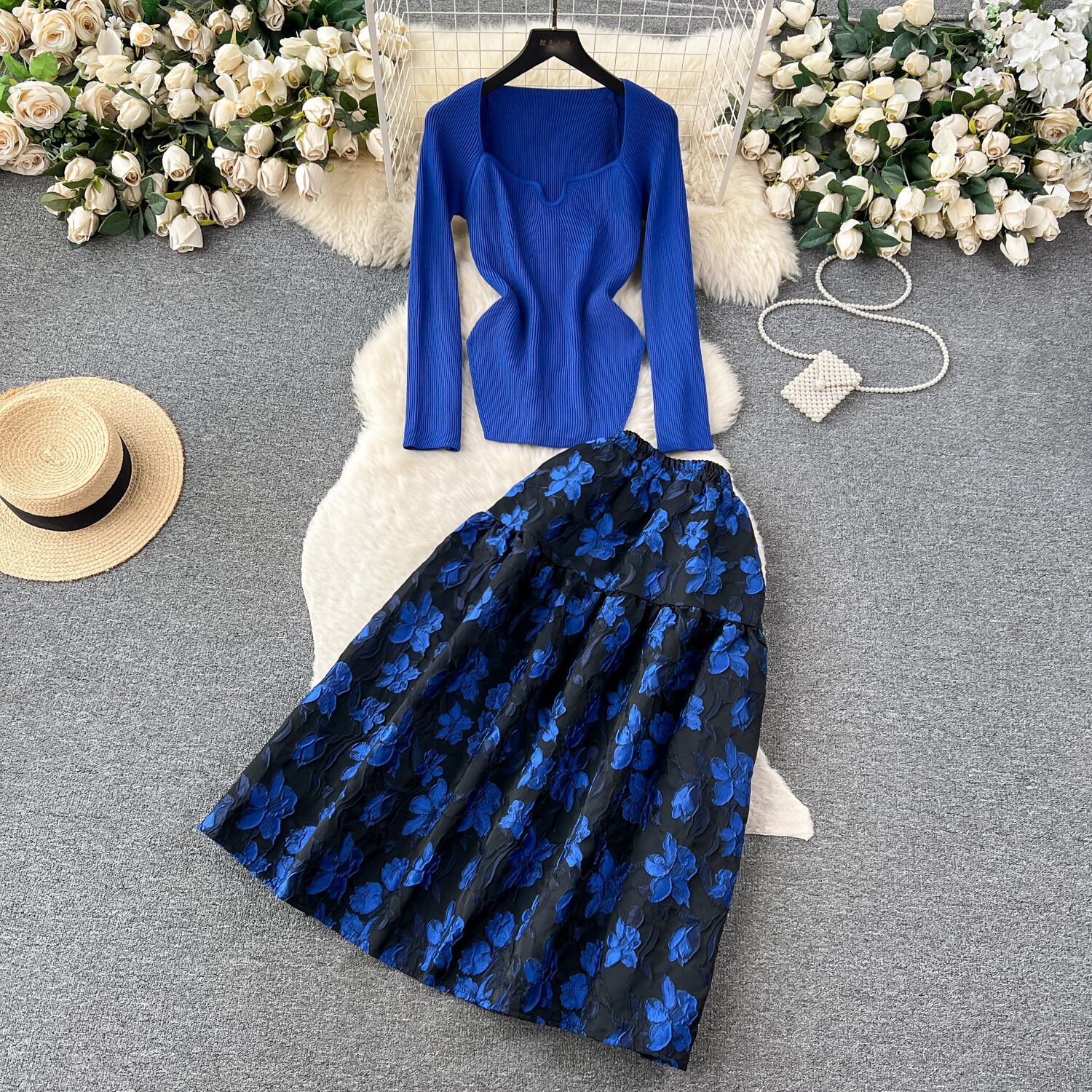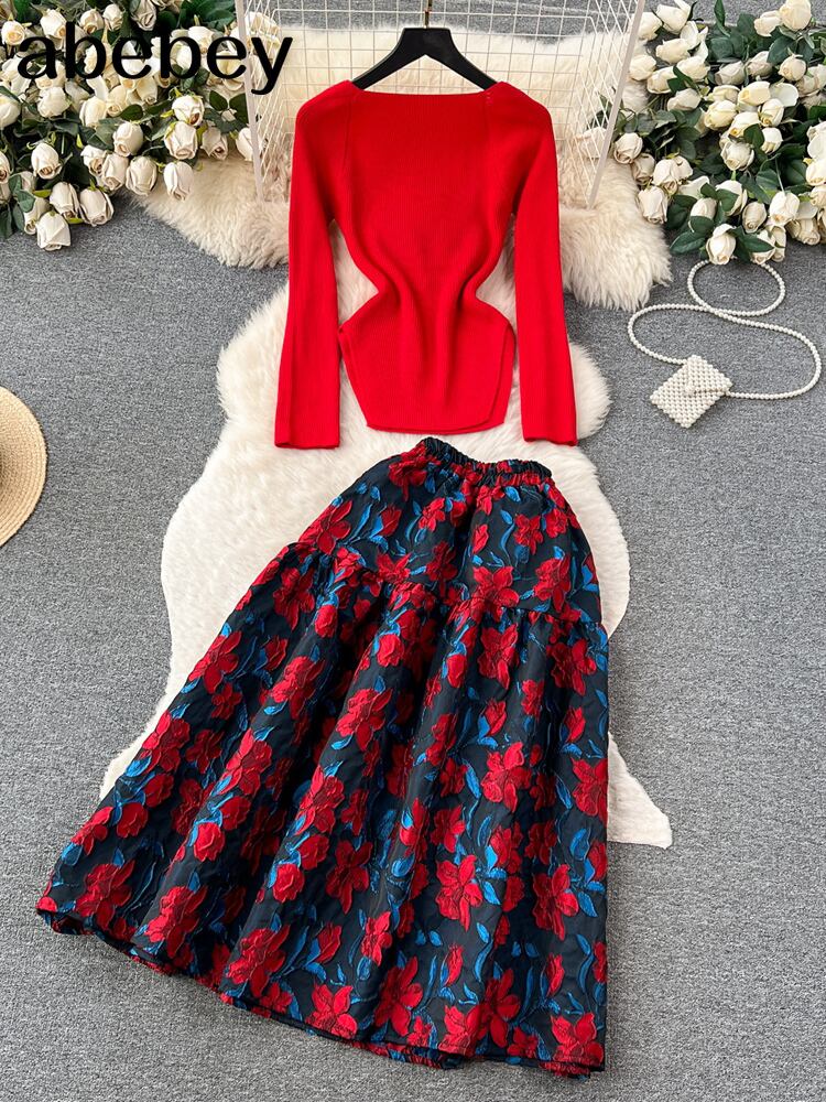 秋セータースーツスパンコールニットプルオーバー+弾性プリント花柄ミディスカートオフィスレディツーピースセット エラスティック 伸縮 オータム 秋物 会社 学校 通勤や通学にも