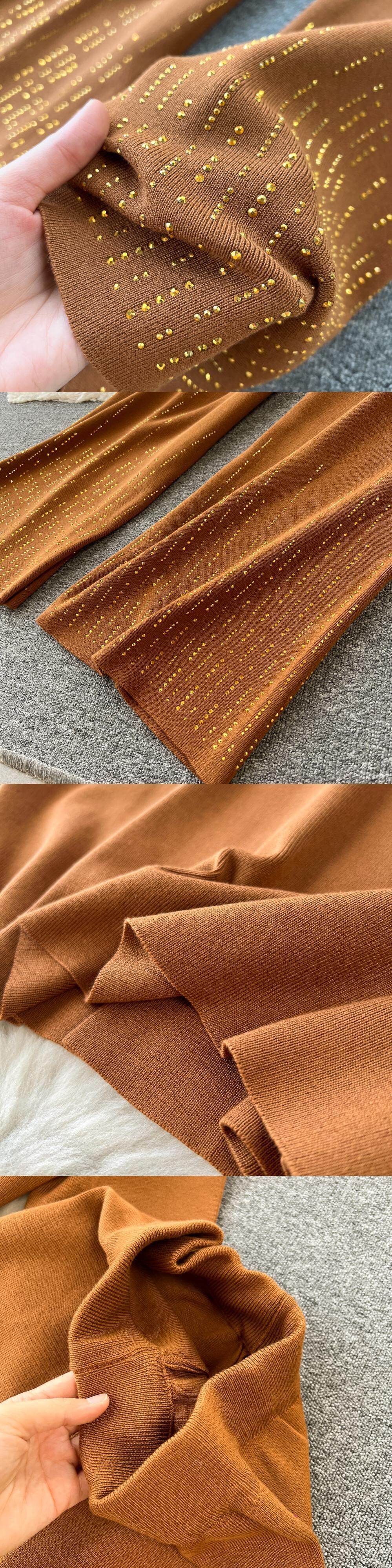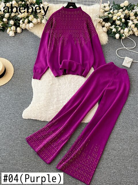 ビーズルーズニットセットOネックプルオーバー+ワイドレッグロングパンツオーバーサイズセータースーツ ワイドパンツ