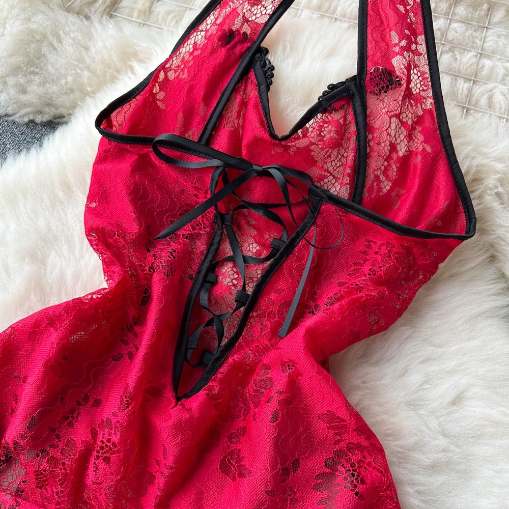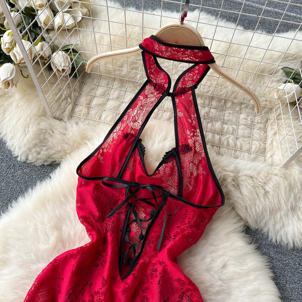 薄手エロレースパジャマ刺繍レースアップスキニースプリットチャイナ下着夏ランジェリーホルターナイトドレス サマー 夏物