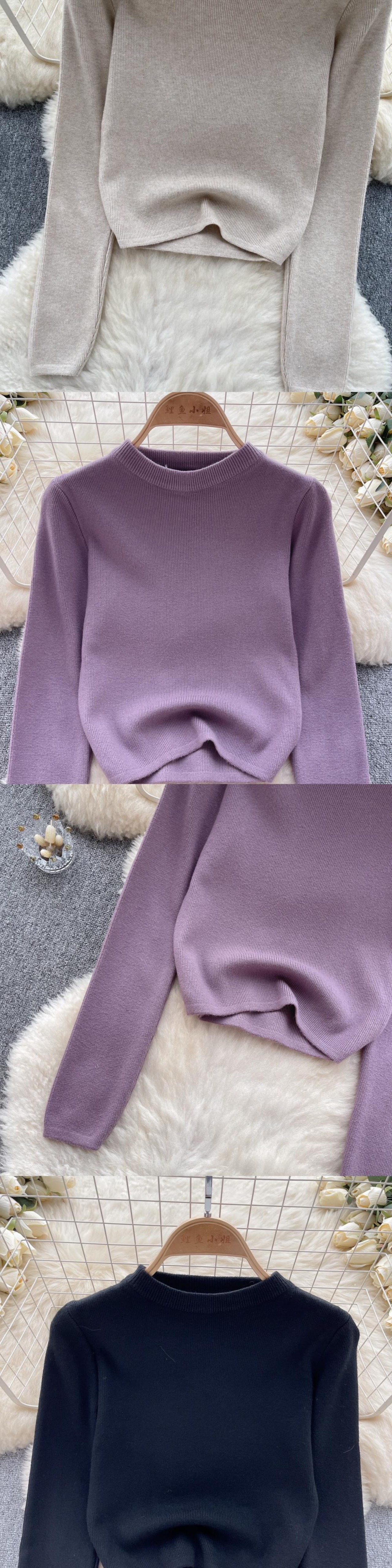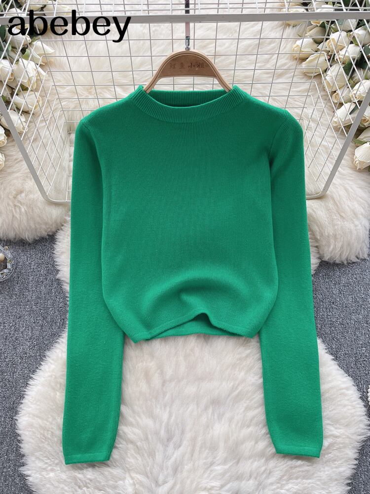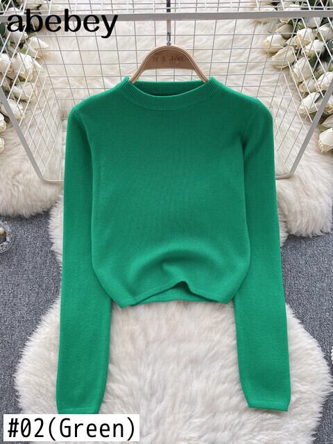 リブニットプルオーバー秋長袖 O ネックスリム弾性ウエスト暖かい冬セータートップ ロング エラスティック 伸縮 オータム 秋物 ウィンター 冬物 Oネック ソリッドカラー