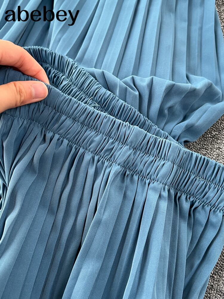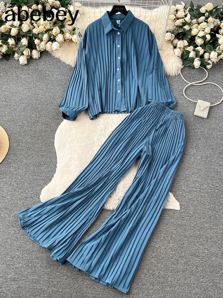 シニアプリーツスーツターンダウンネック長袖シャーリングトップ+ウエストワイドレッグパンツ秋ストリートウェアセット ロング オータム 秋物 ワイドパンツ ソリッドカラー