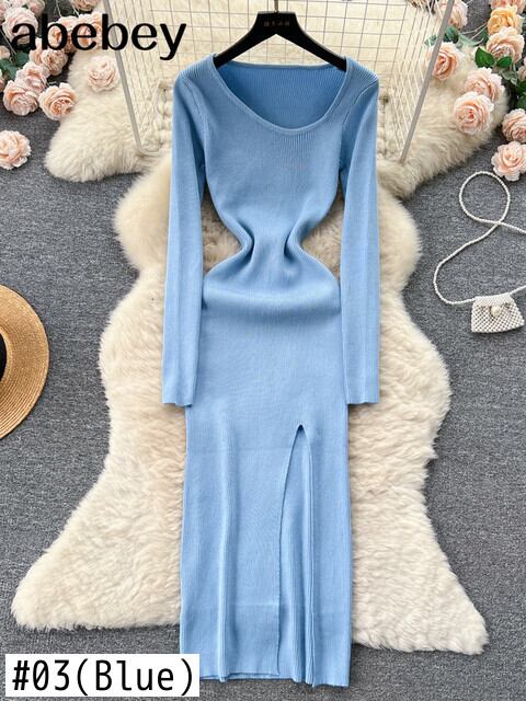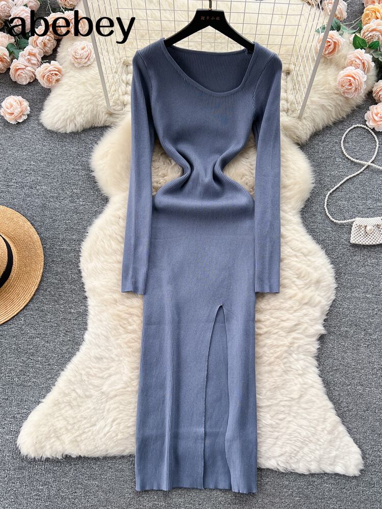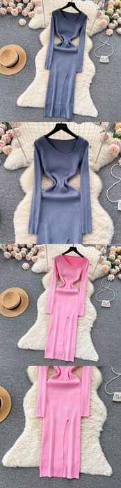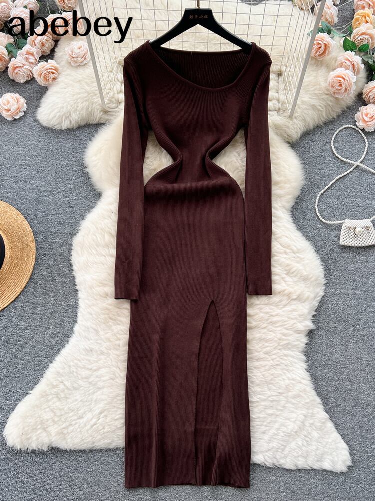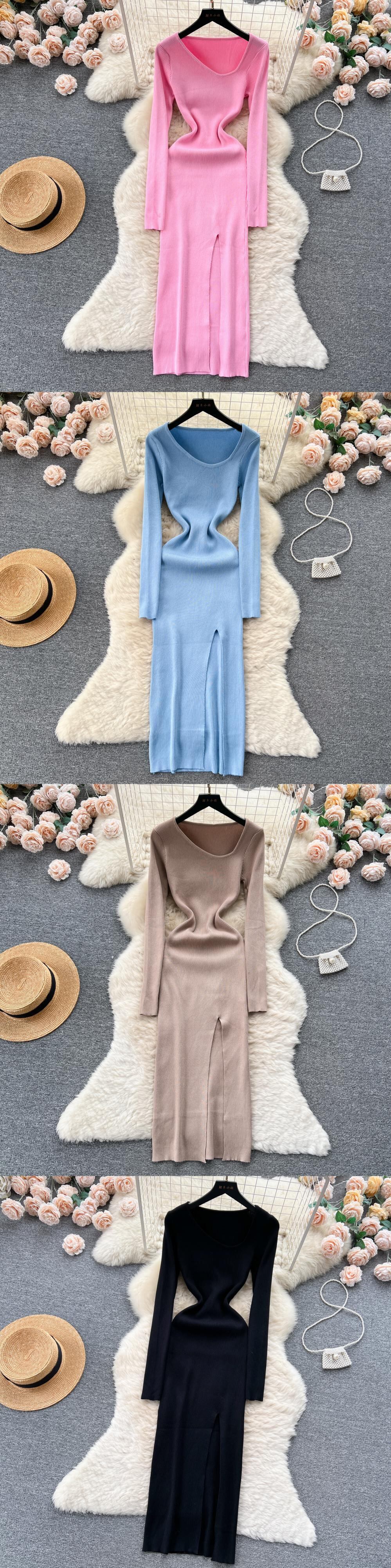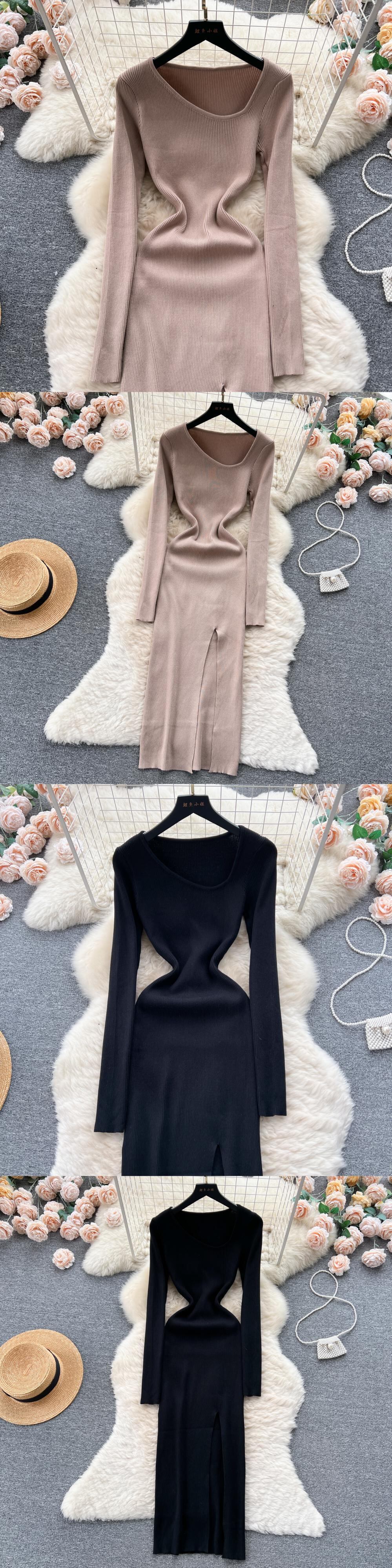 フレンチシニアニットロングドレス不規則ネック弾性ウエスト中空気質秋セクシースリムスプリットドレス エラスティック 伸縮 オータム 秋物