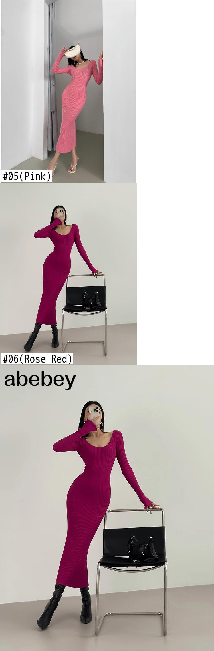 秋ニットドレス O ネック長袖中空スリムフィットフランスボディコンパーティードレス ロング オータム 秋物 Oネック ソリッドカラー