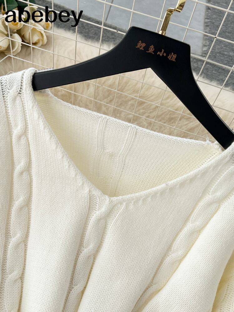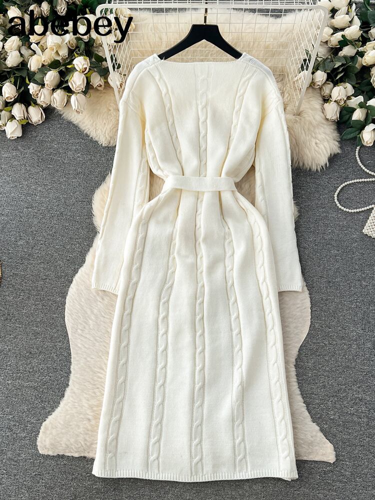 秋セータードレスソリッドルーズ V ネックベルト長袖ストリートオフィスレディニットシックドレス ロング オータム 秋物 ハーネス Vネック ソリッドカラー 会社 学校 通勤や通学にも