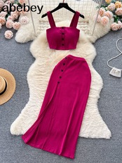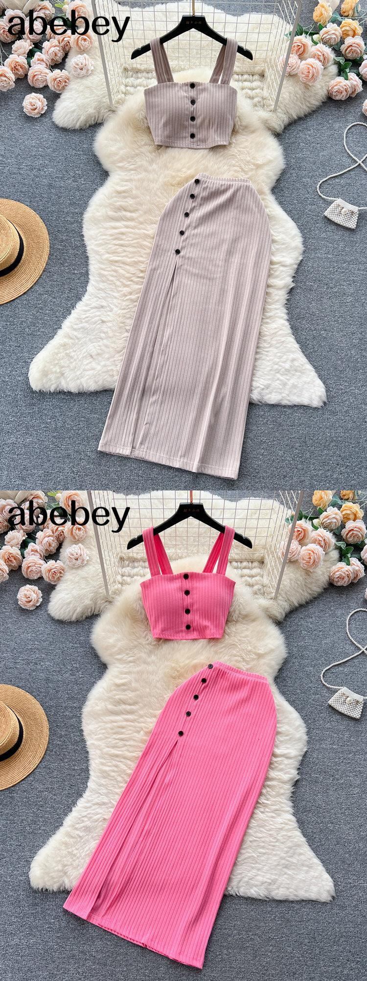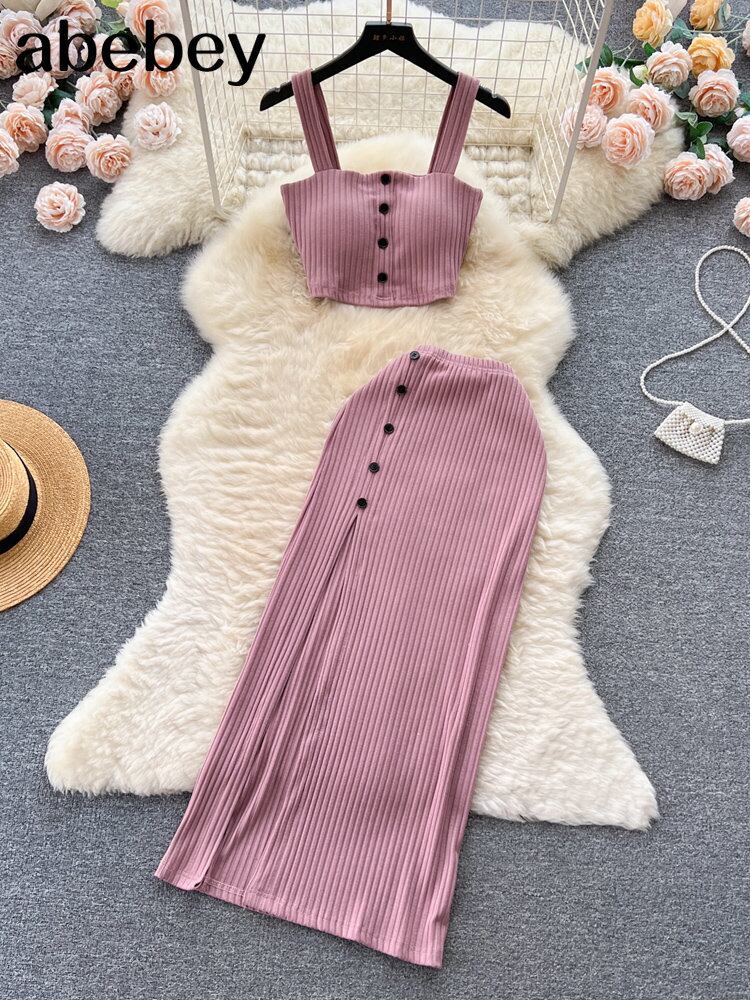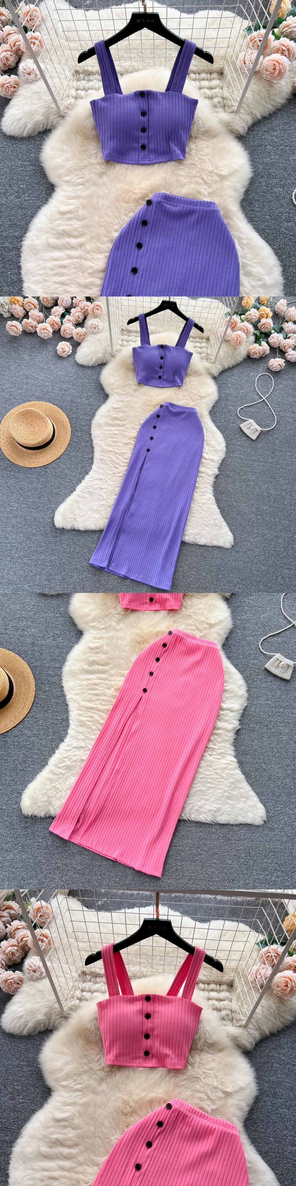 サマーニット 2 枚スーツ背中開いたボタンミニトップ + ウエスト分割ボディコンスカートスリムストリートセット 夏物 ソリッドカラー