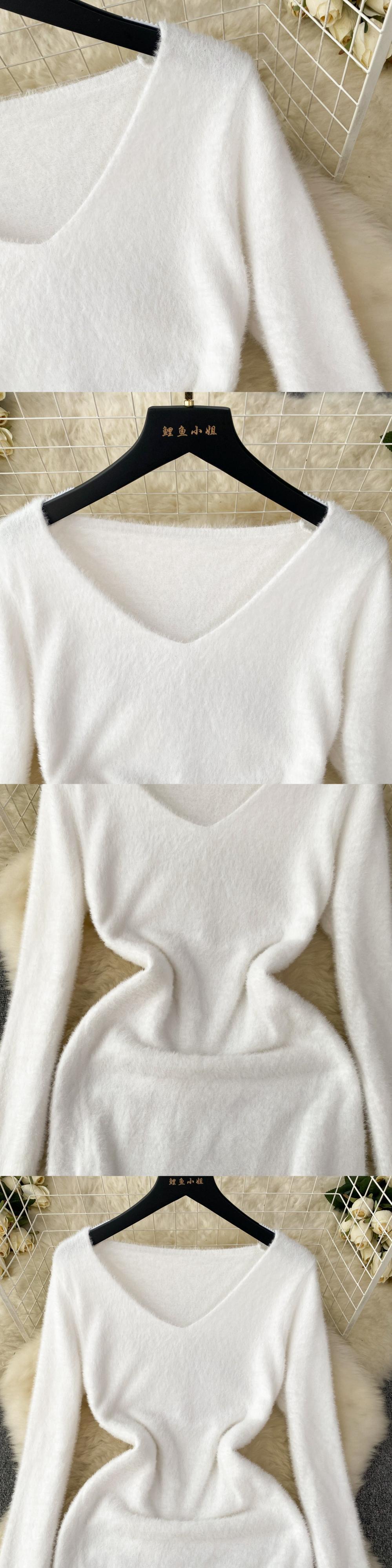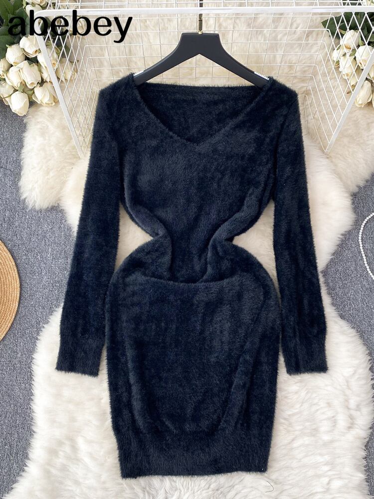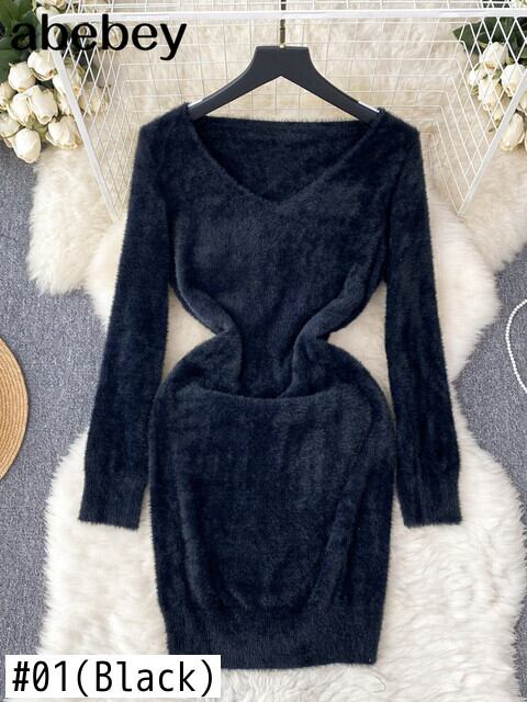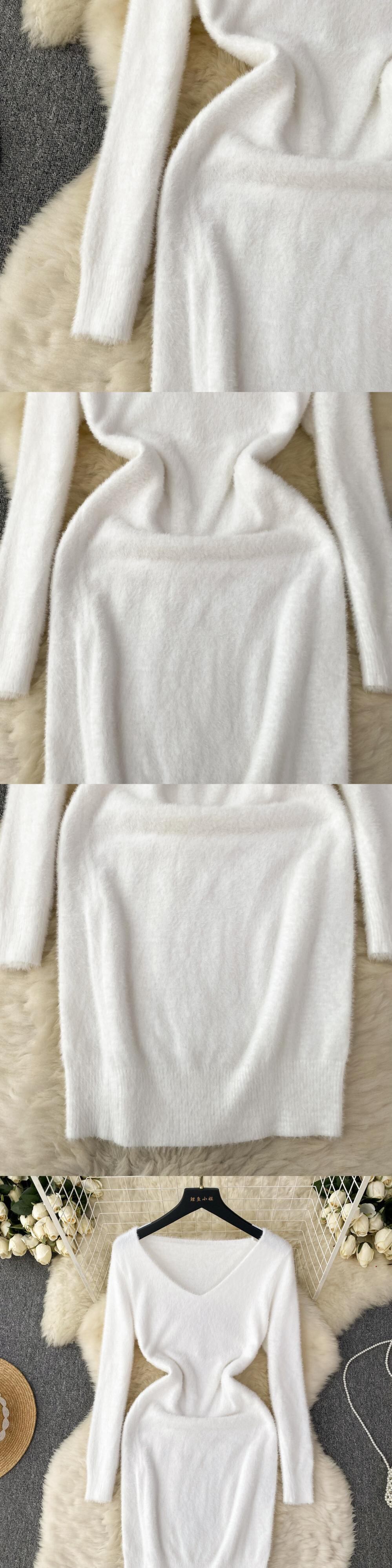 白ニットドレス V ネックセクシースリム弾性ショートベーシックボディコンセータードレス冬ニット暖かいミディドレス ホワイト エラスティック 伸縮 ウィンター 冬物 Vネック