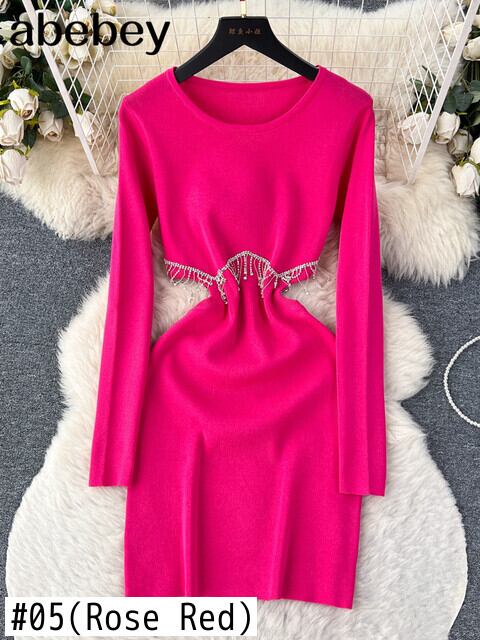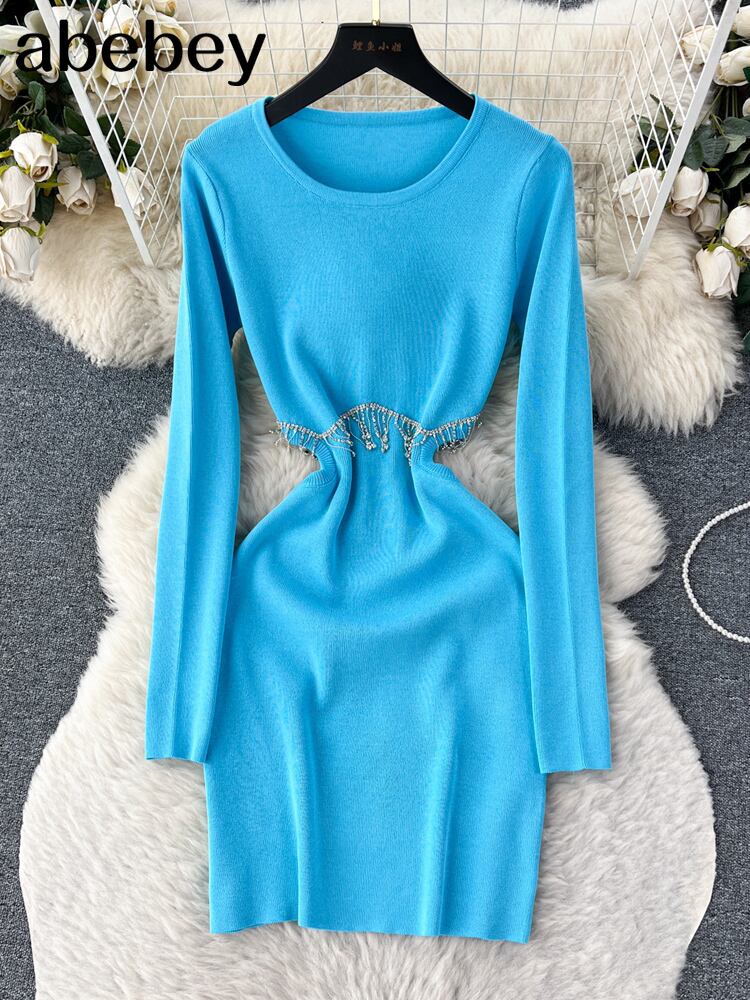 中空アウトセクシーセータードレス O ネック長袖ミニドレス秋ストリートニットボディコンドレス ロング オータム 秋物 Oネック ソリッドカラー