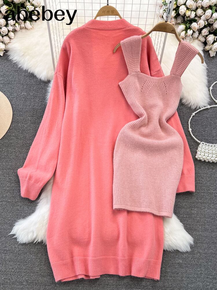ニット 2 枚セットセーター長袖カーディガンとストレッチボディコーン V ネックスリップドレス秋冬ペンシルドレス ロング オータム 秋物 ウィンター 冬物