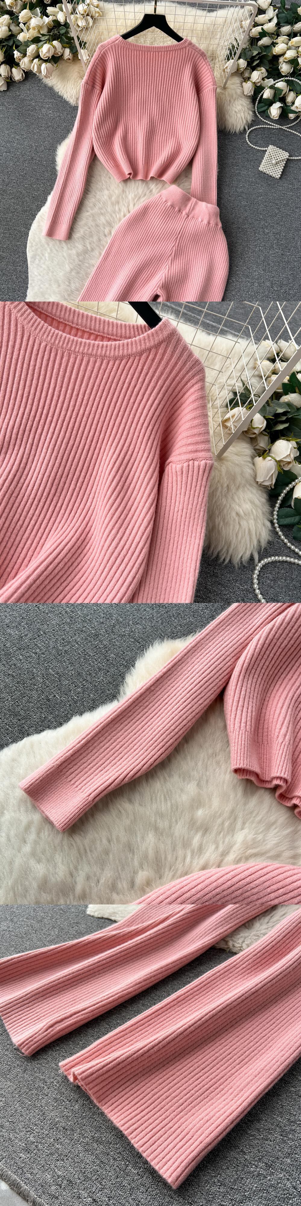 ニットスーツ O ネックフルスリーブルーズプルオーバー + 巾着ワイド脚長パンツスタイルストライプセット ロング Oネック ワイドレッグ ワイドパンツ
