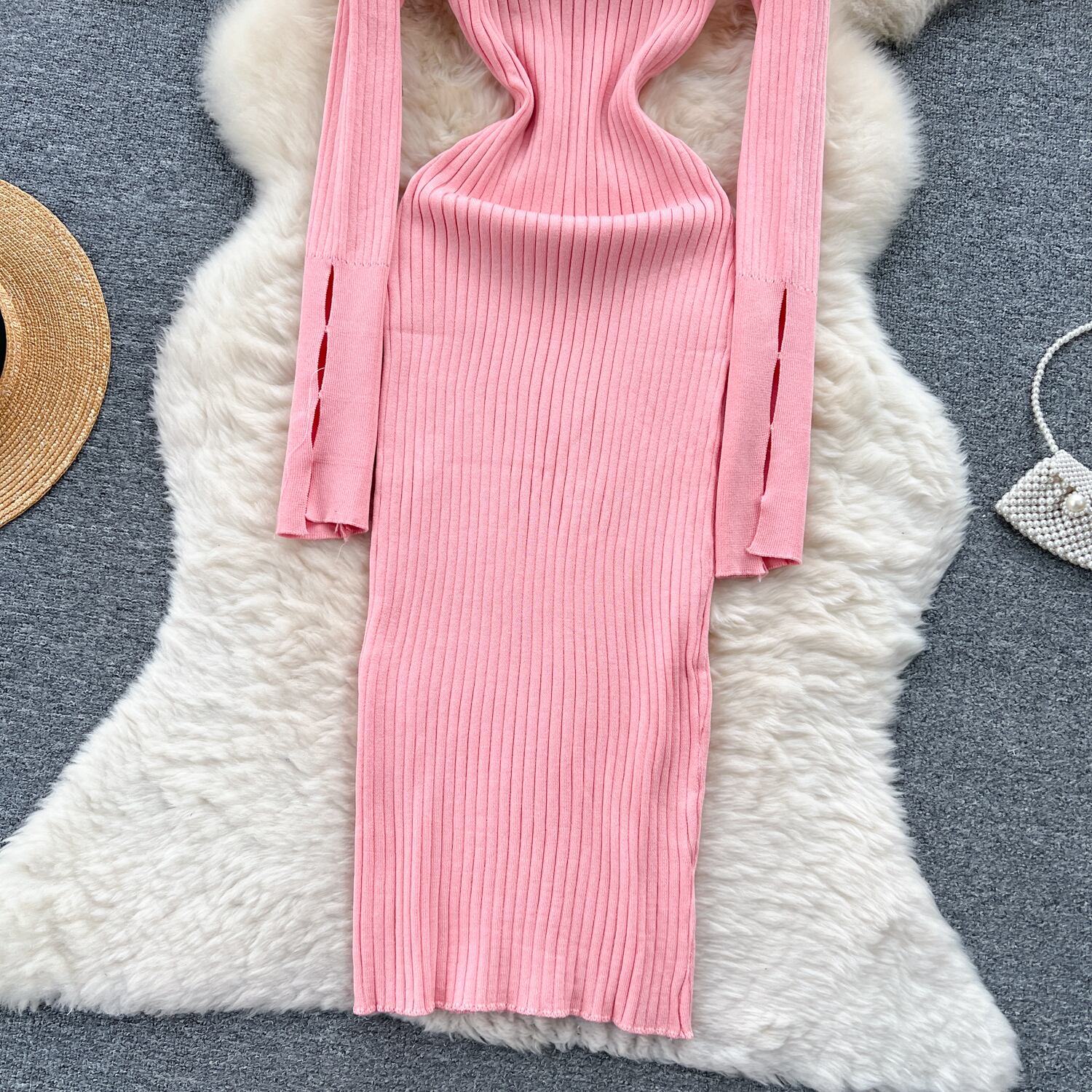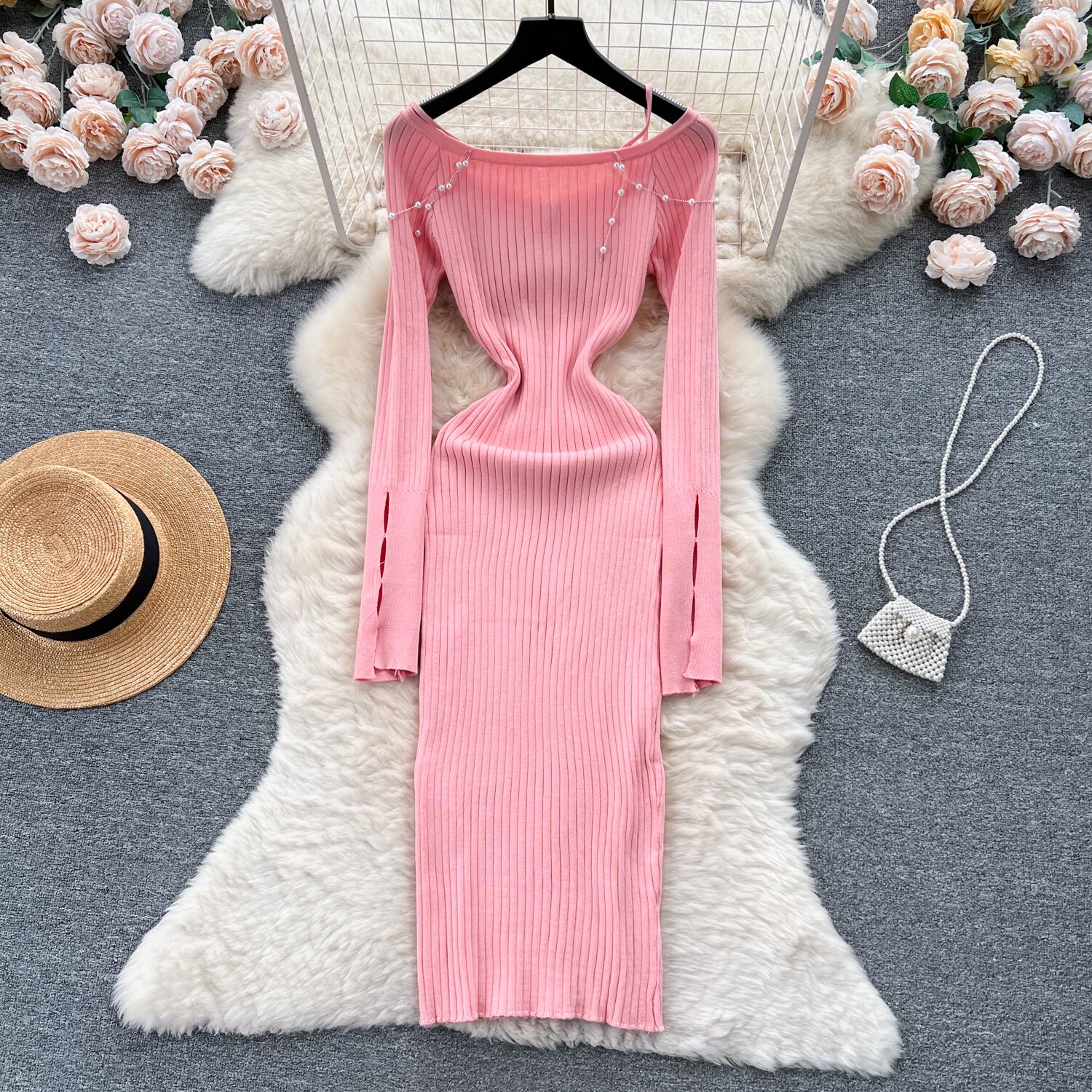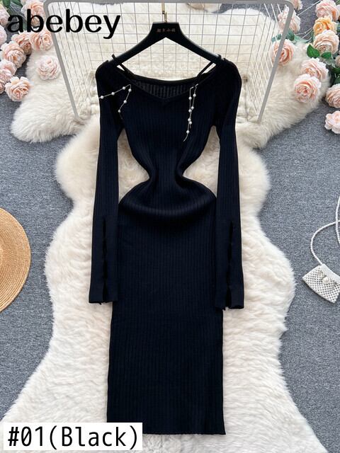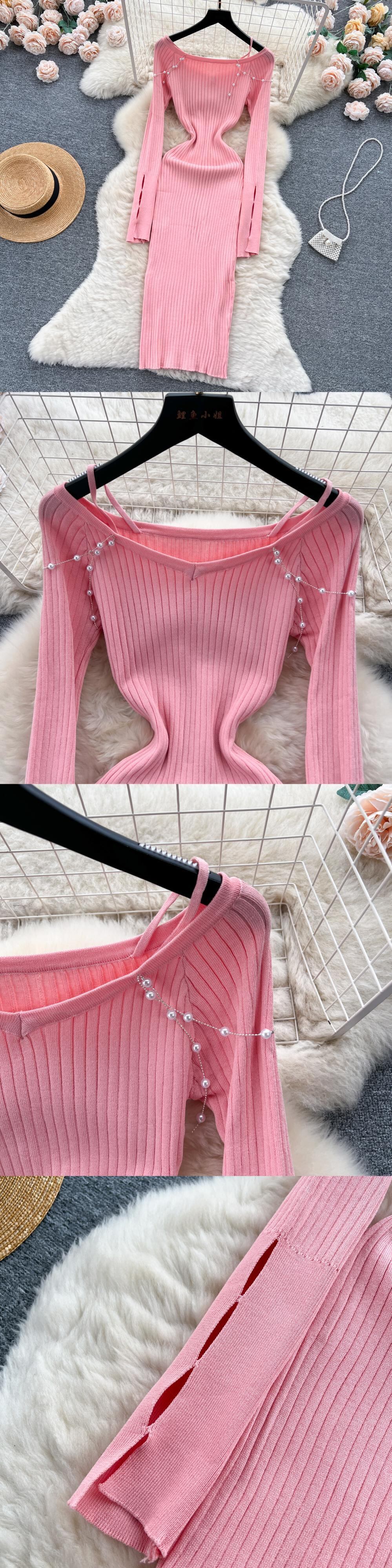 パールニットドレスストラップスラッシュネックロング中空アウト袖秋シックストライプパーティードレス オータム 秋物 真珠