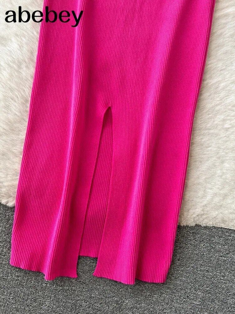 フレンチシニアニットロングドレス O ネック弾性ウエスト気質秋セクシースリムスプリットドレス エラスティック 伸縮 オータム 秋物 Oネック