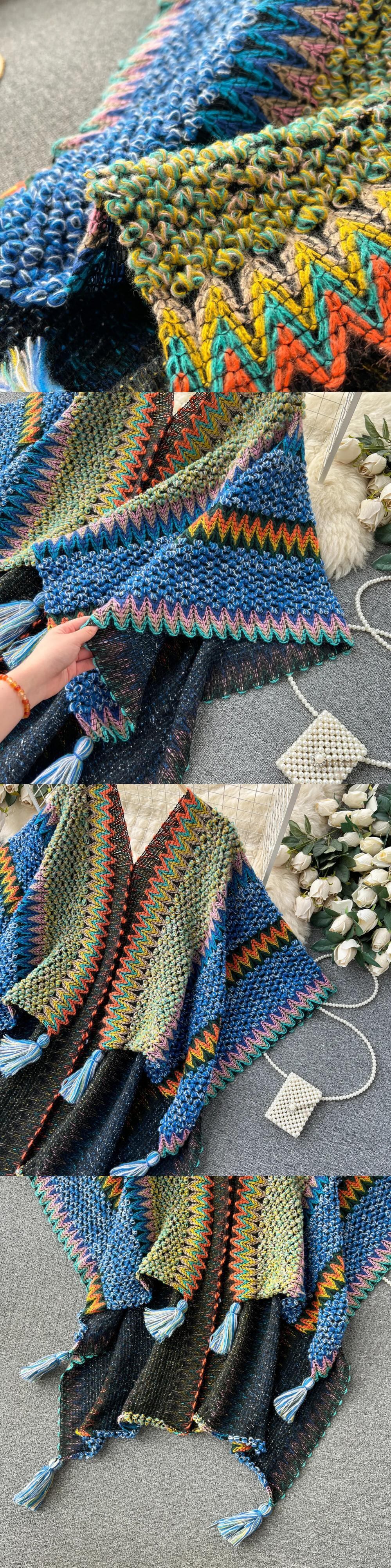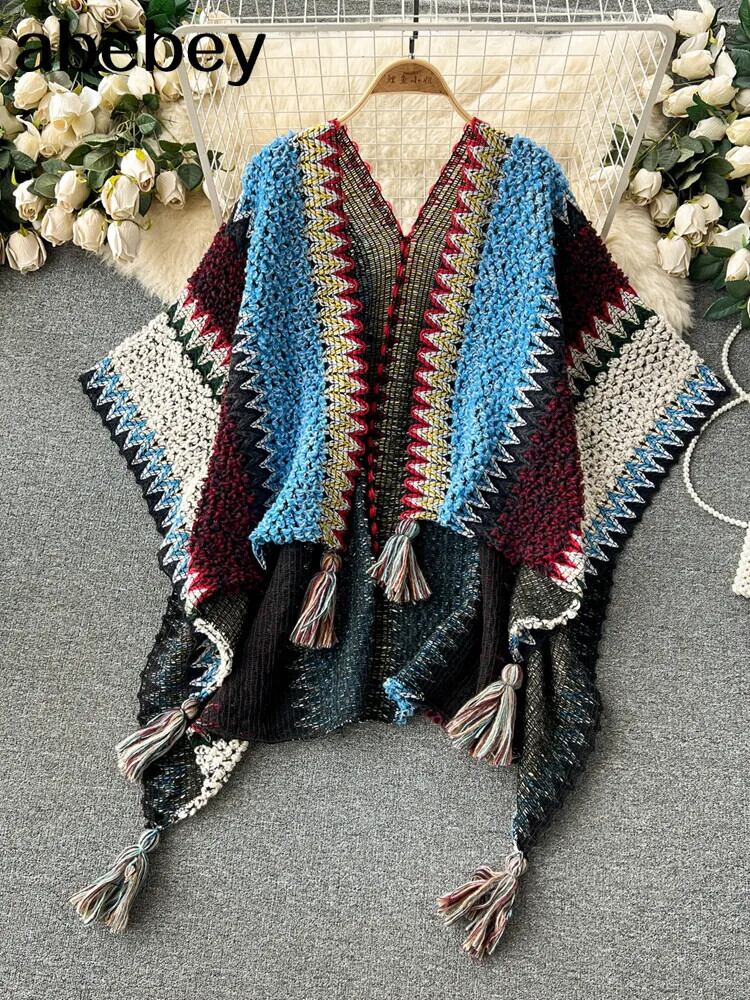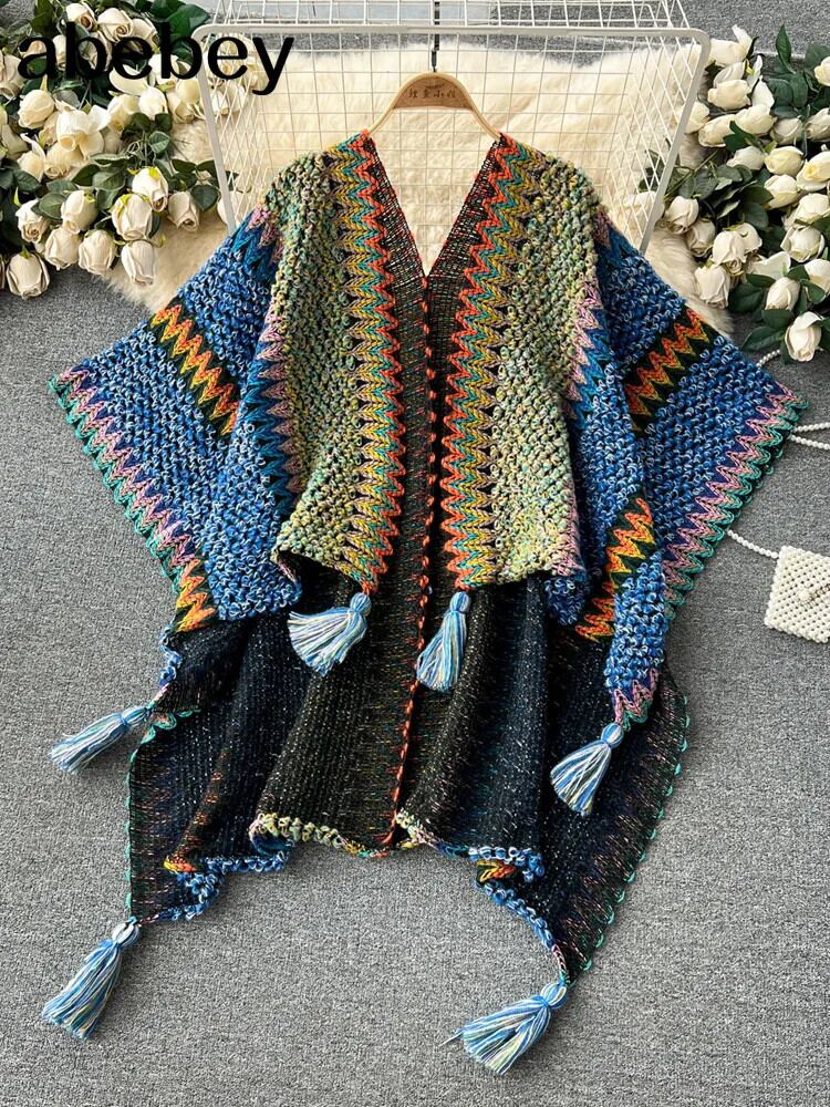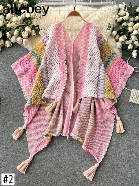 オーバーサイズ秋ケープエスニックチェック柄ルーズカーディガンテルセーター自由奔放生きるニットスカーフカーディガン オータム 秋物